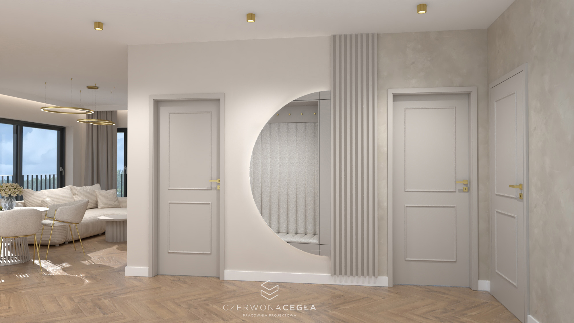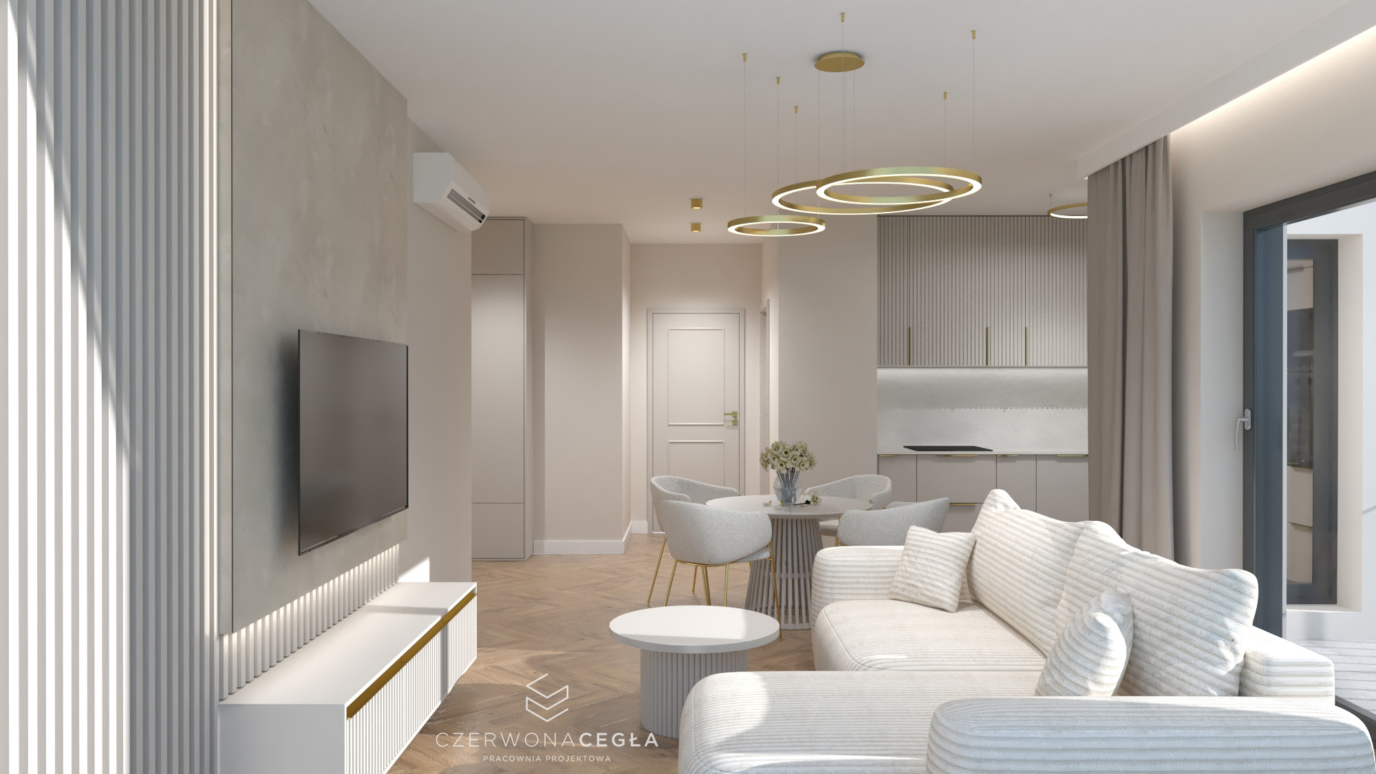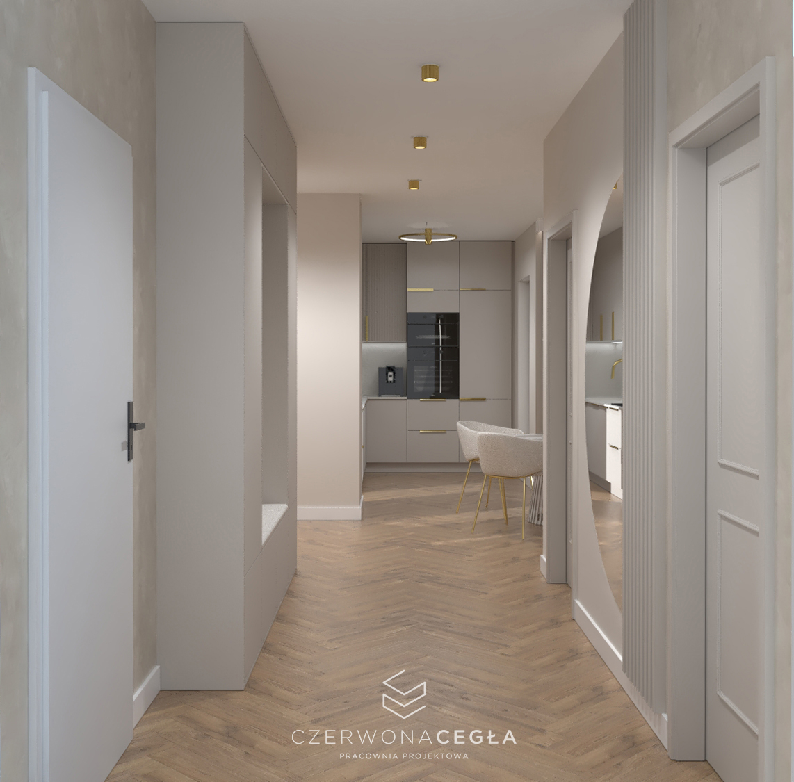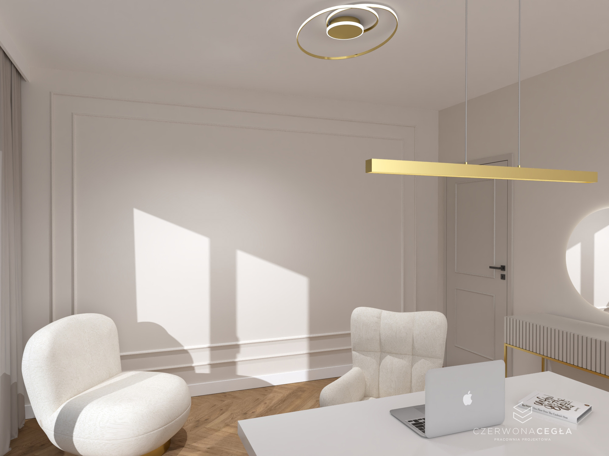Projekt mieszkania o świetlistym wnętrzu w stylu Modern Classic, gdzie kremowe beże spotykają się z biżuteryjnymi akcentami szczotkowanego złota. Serce apartamentu stanowi reprezentacyjny salon z aneksem kuchennym, w którym połączenie odcieni beżu ze złotem świetnie się komponuje. Prywatna strefa obejmuje sypialnię z miękkim, tapicerowanym wezgłowiem, stylowy gabinet do pracy twórczej oraz łazienkę w jasnym wykończeniu, przypominającą ekskluzywne SPA. Całość dopełniają lustra i subtelne sztukaterie, tworząc przestrzeń pełną blasku, elegancji i ponadczasowego szyku.
