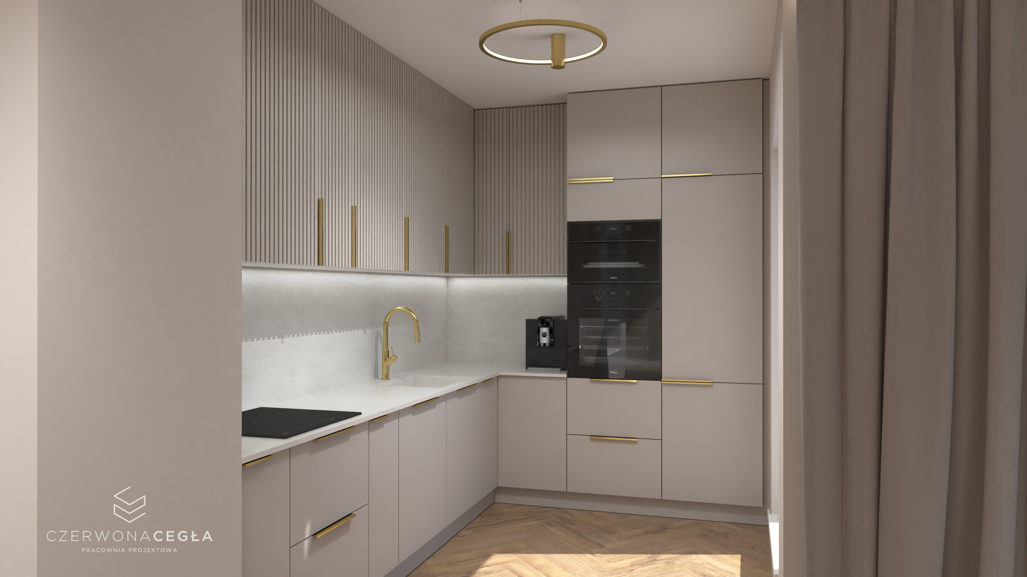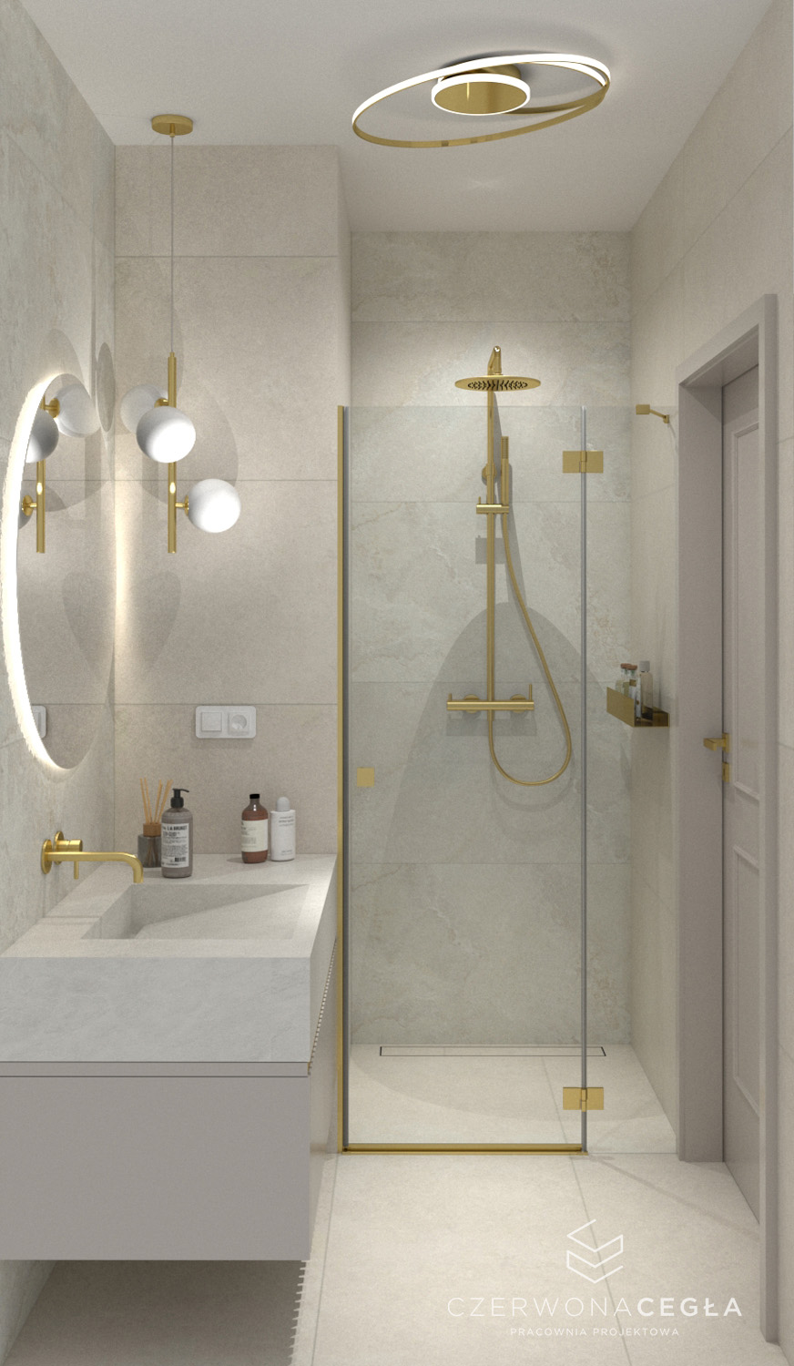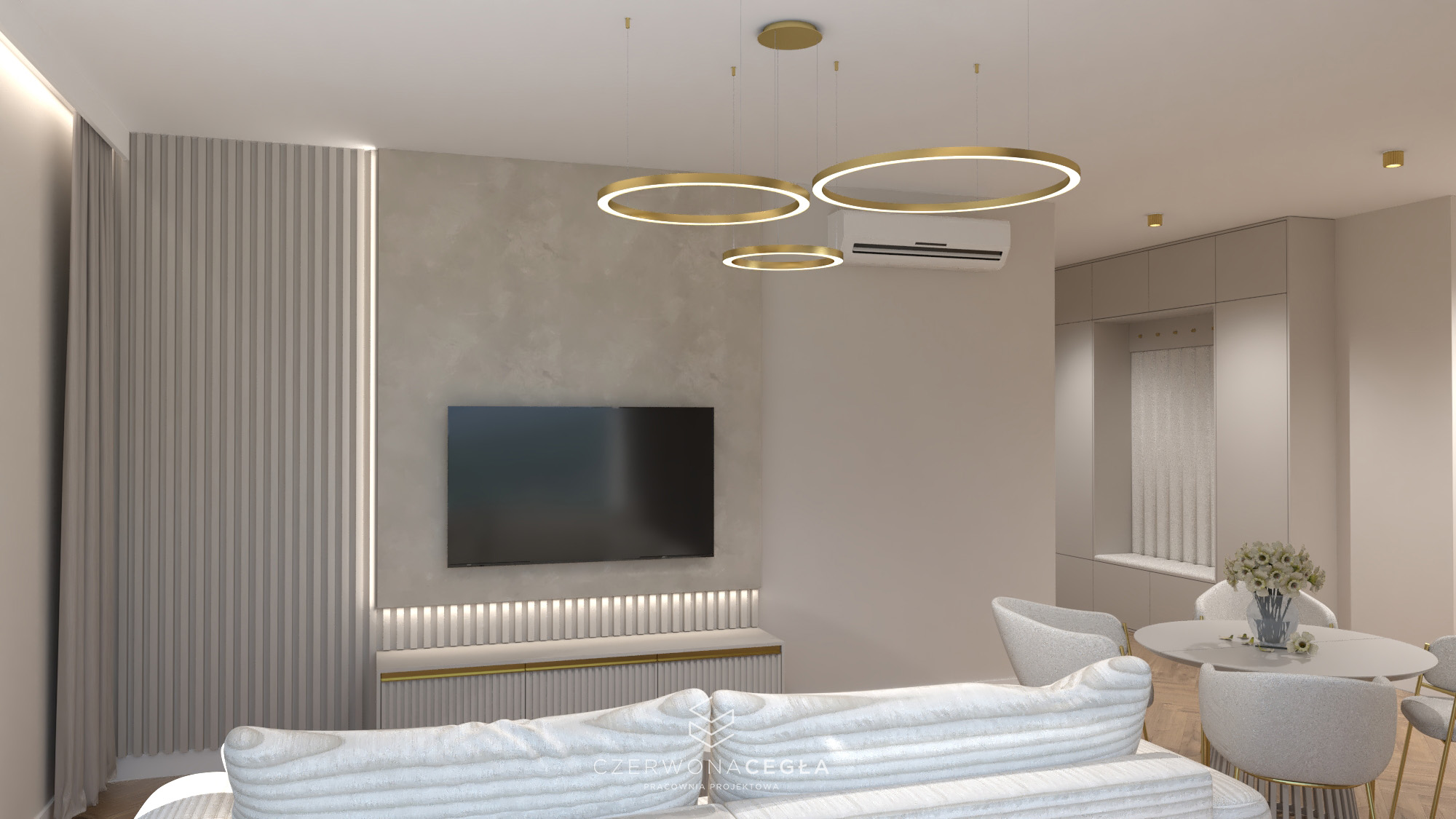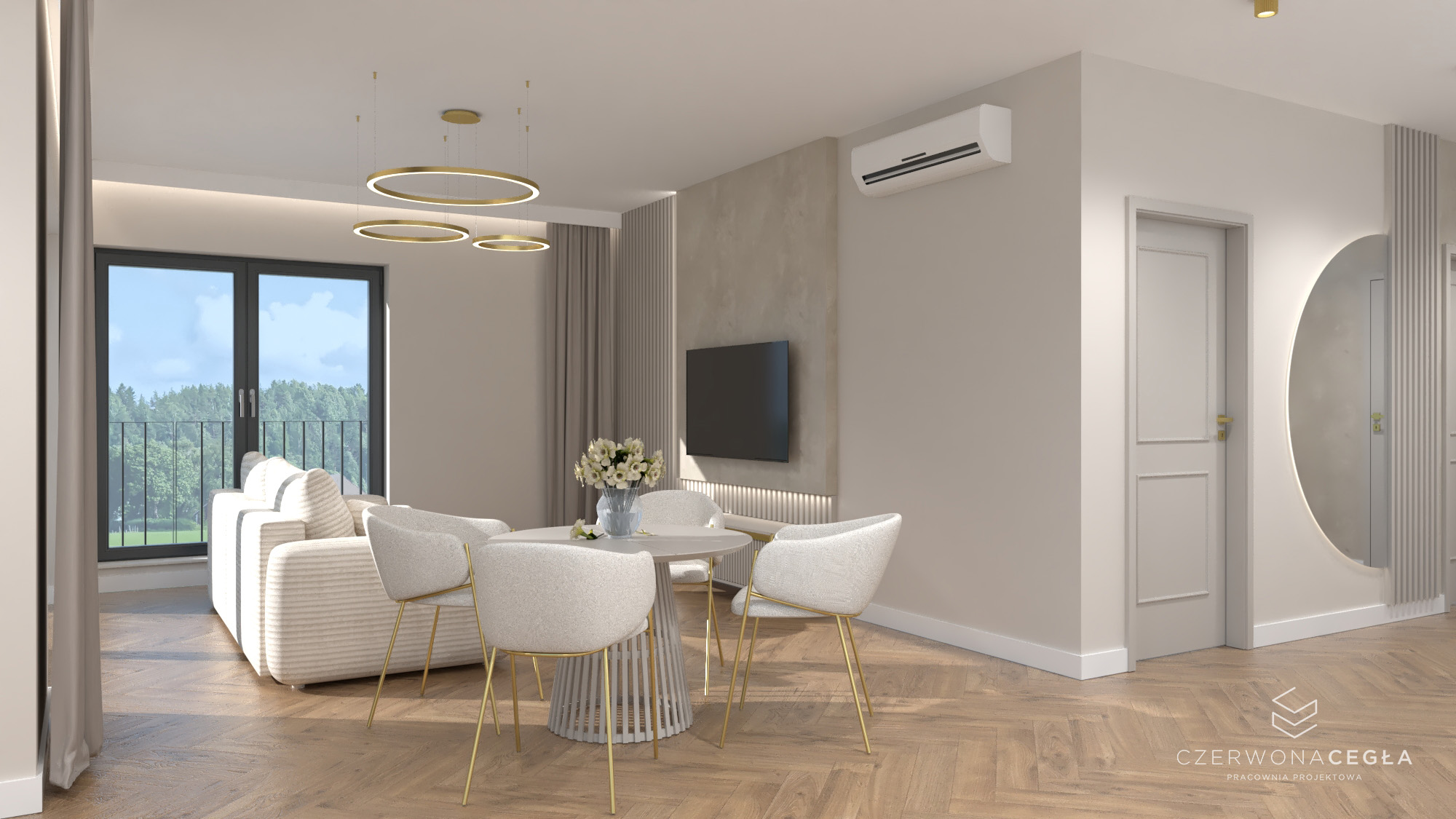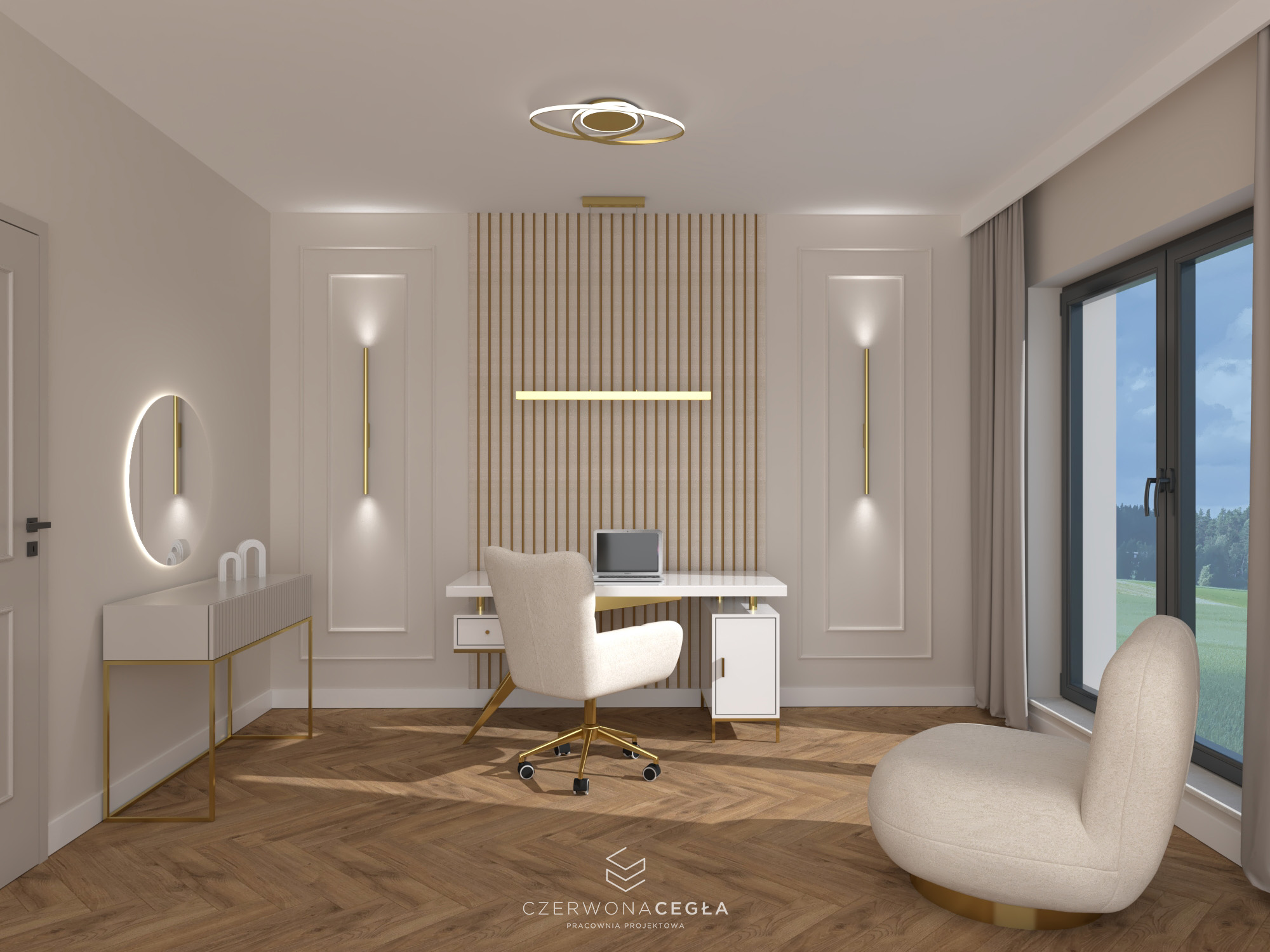 Projekt mieszkania o świetlistym wnętrzu w stylu Modern Classic, gdzie kremowe beże spotykają się z biżuteryjnymi akcentami szczotkowanego złota. Serce apartamentu stanowi reprezentacyjny salon z aneksem kuchennym, w którym połączenie odcieni beżu ze złotem świetnie się komponuje. Prywatna strefa obejmuje sypialnię z miękkim, tapicerowanym wezgłowiem, stylowy gabinet do pracy twórczej oraz łazienkę w jasnym wykończeniu, przypominającą ekskluzywne SPA. Całość dopełniają lustra i subtelne sztukaterie, tworząc przestrzeń pełną blasku, elegancji i ponadczasowego szyku.