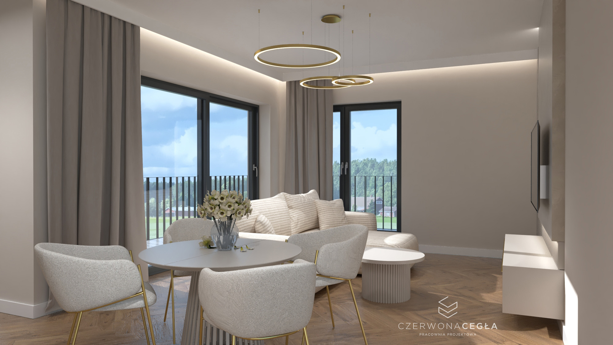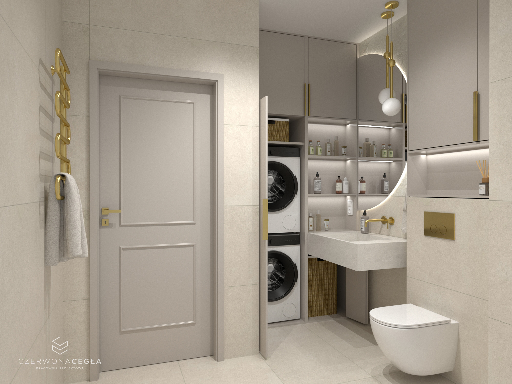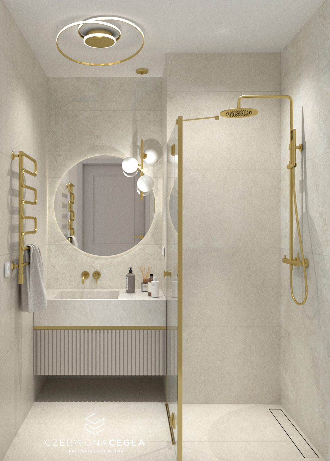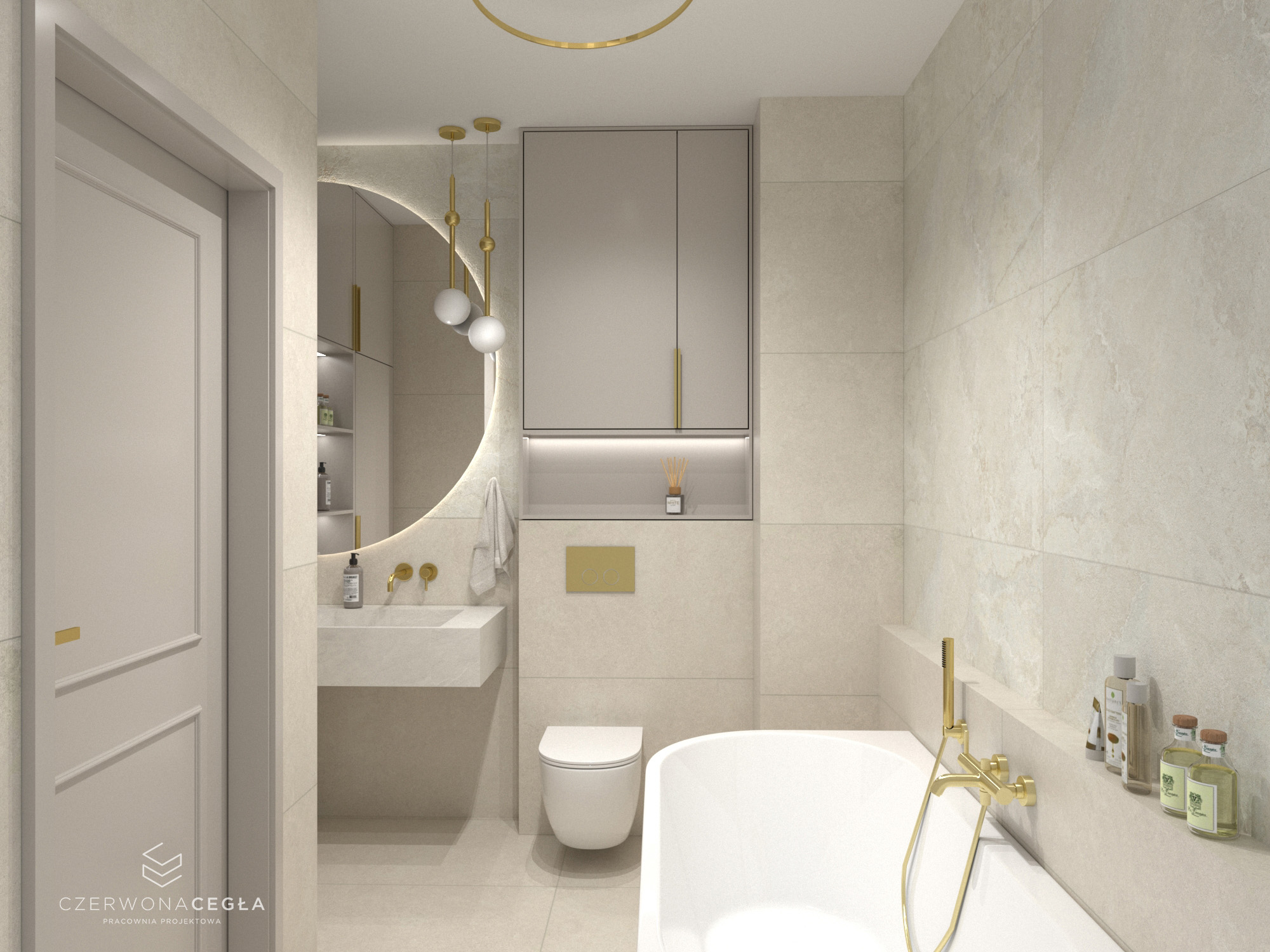 Projekt mieszkania o świetlistym wnętrzu w stylu Modern Classic, gdzie kremowe beże spotykają się z biżuteryjnymi akcentami szczotkowanego złota. Serce apartamentu stanowi reprezentacyjny salon z aneksem kuchennym, w którym połączenie odcieni beżu ze złotem świetnie się komponuje. Prywatna strefa obejmuje sypialnię z miękkim, tapicerowanym wezgłowiem, stylowy gabinet do pracy twórczej oraz łazienkę w jasnym wykończeniu, przypominającą ekskluzywne SPA. Całość dopełniają lustra i subtelne sztukaterie, tworząc przestrzeń pełną blasku, elegancji i ponadczasowego szyku.