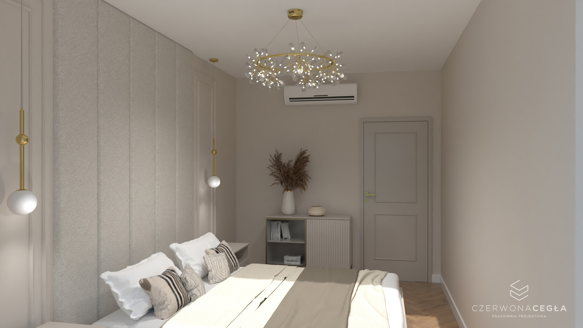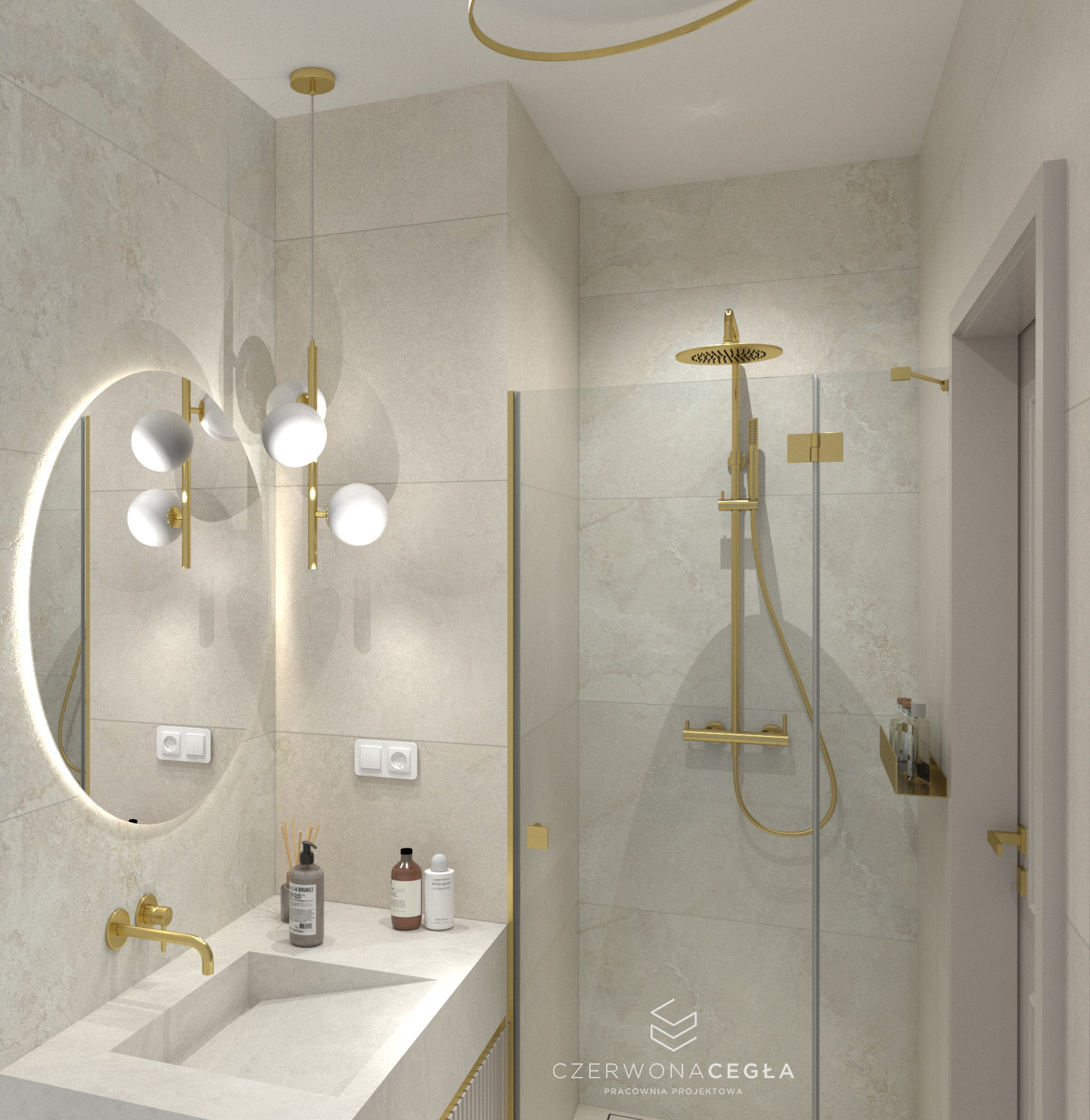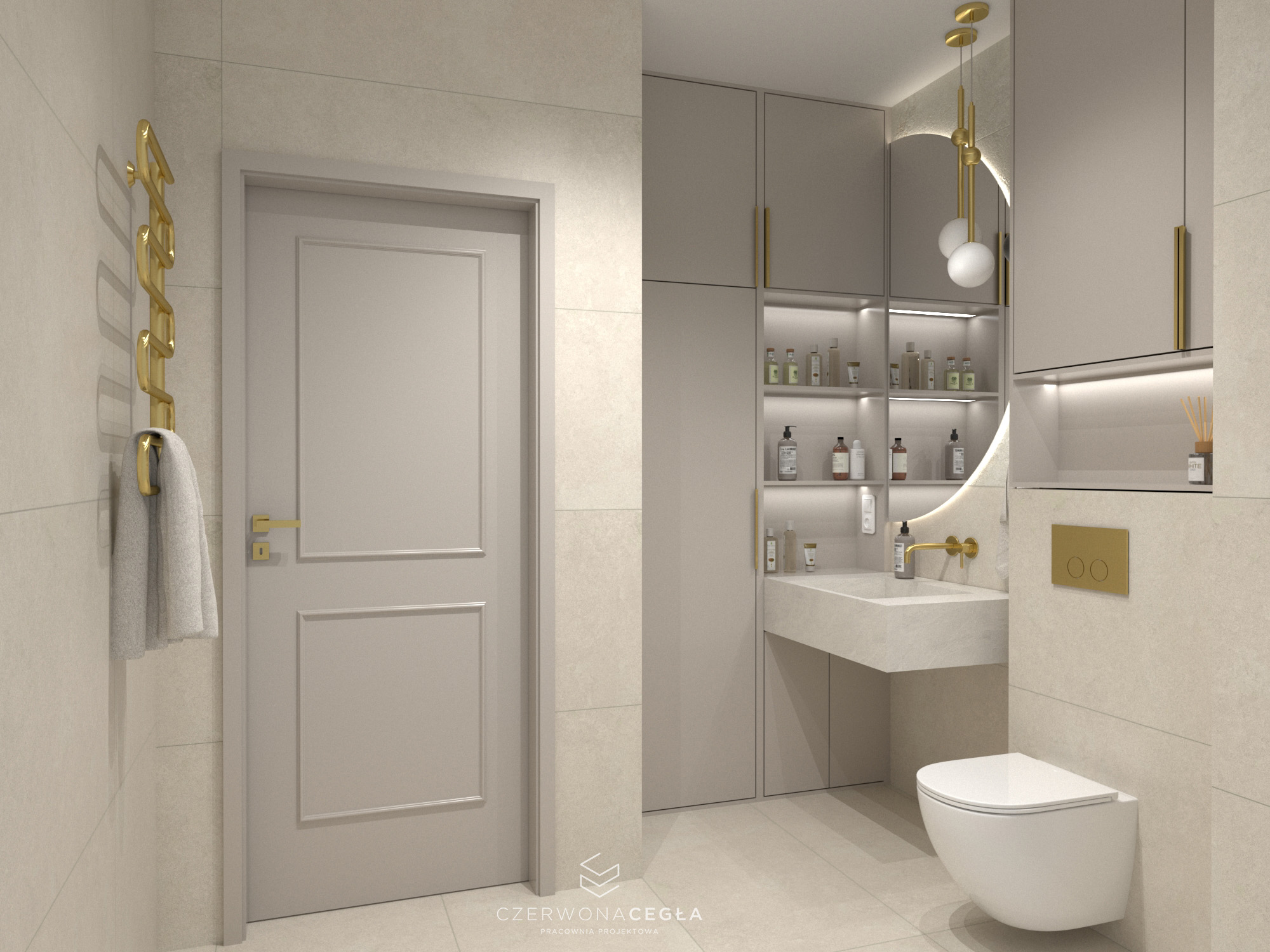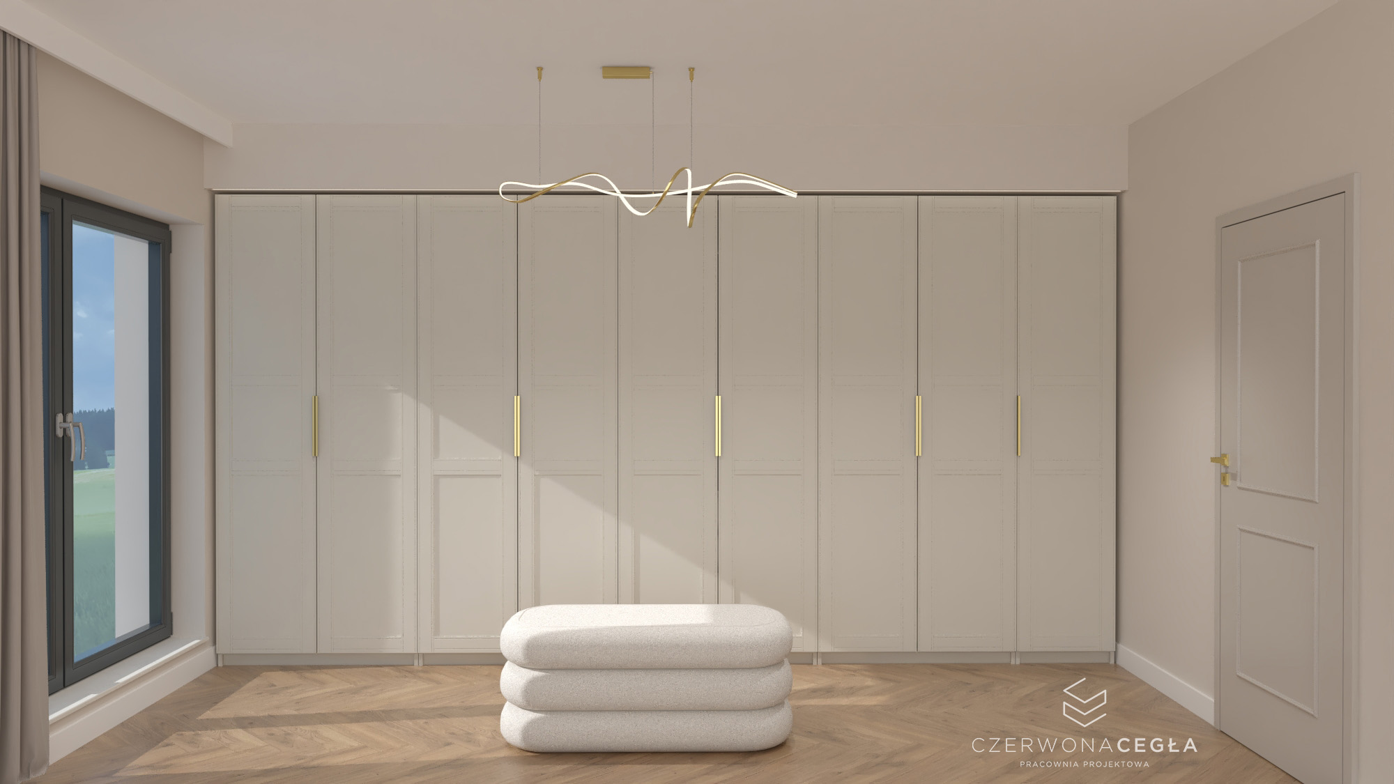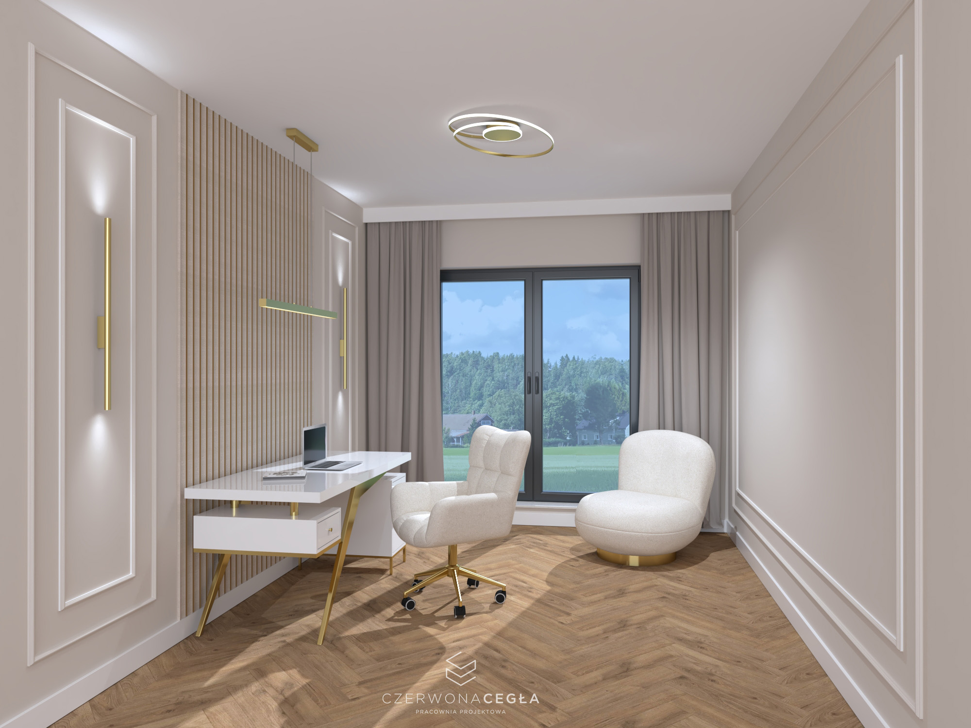 Projekt mieszkania o świetlistym wnętrzu w stylu Modern Classic, gdzie kremowe beże spotykają się z biżuteryjnymi akcentami szczotkowanego złota. Serce apartamentu stanowi reprezentacyjny salon z aneksem kuchennym, w którym połączenie odcieni beżu ze złotem świetnie się komponuje. Prywatna strefa obejmuje sypialnię z miękkim, tapicerowanym wezgłowiem, stylowy gabinet do pracy twórczej oraz łazienkę w jasnym wykończeniu, przypominającą ekskluzywne SPA. Całość dopełniają lustra i subtelne sztukaterie, tworząc przestrzeń pełną blasku, elegancji i ponadczasowego szyku.