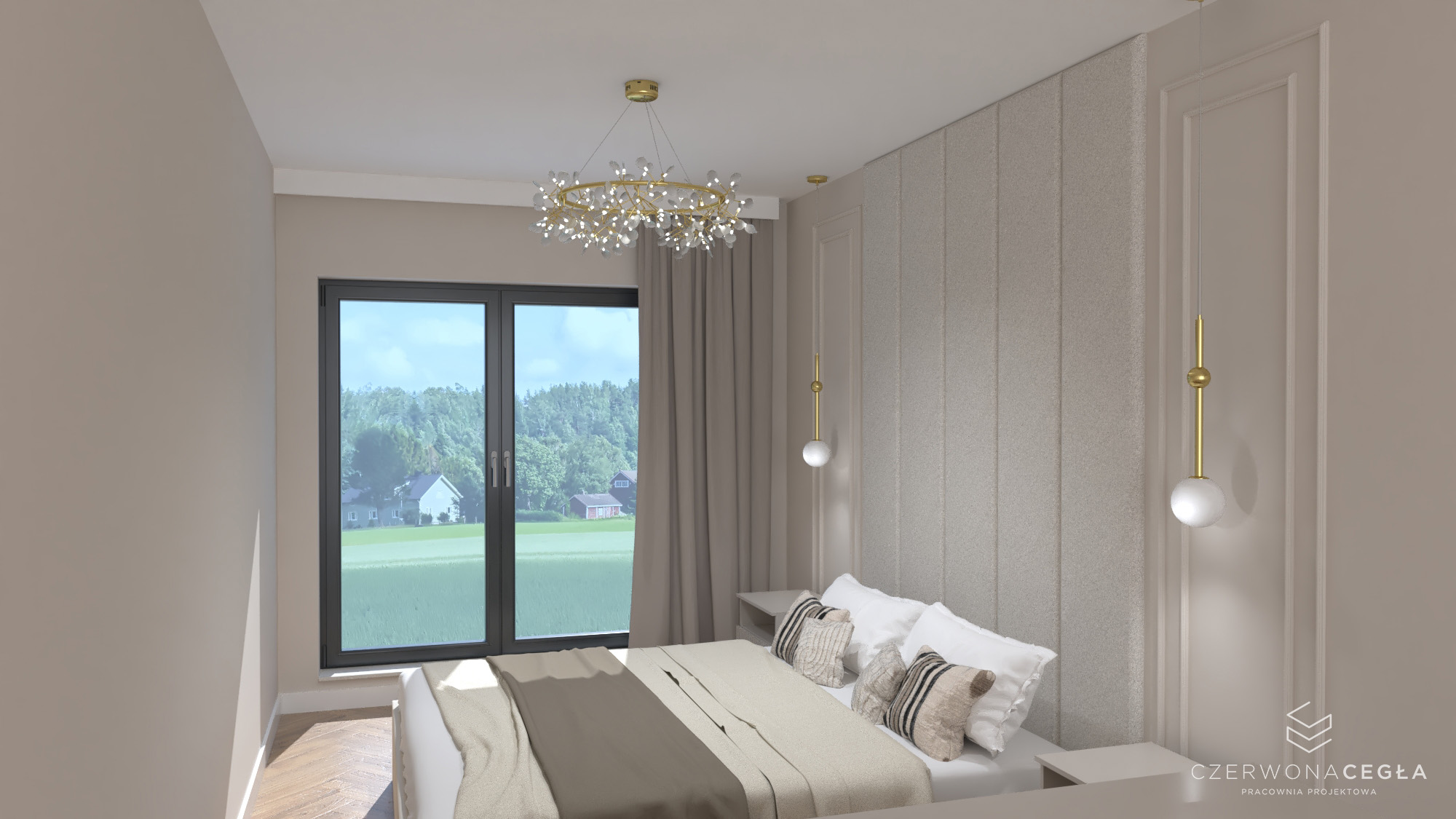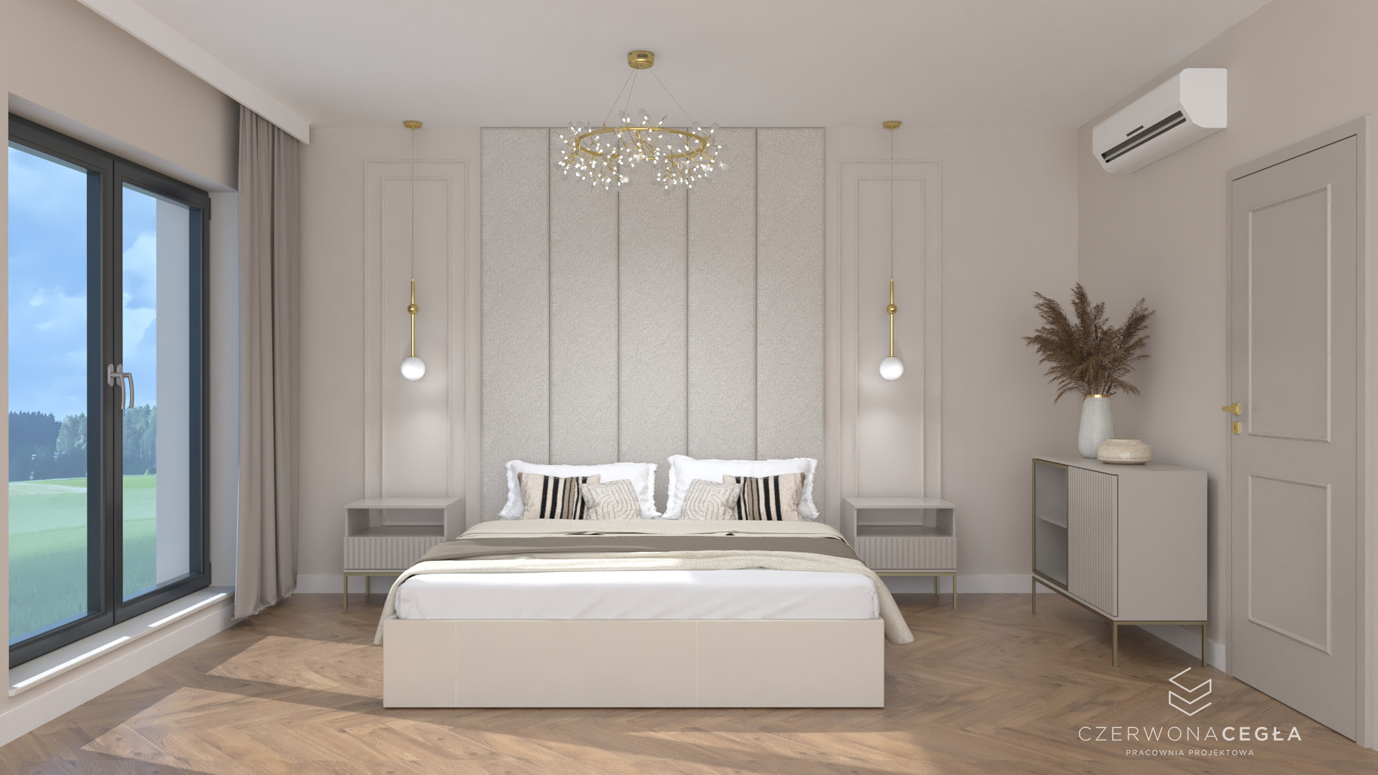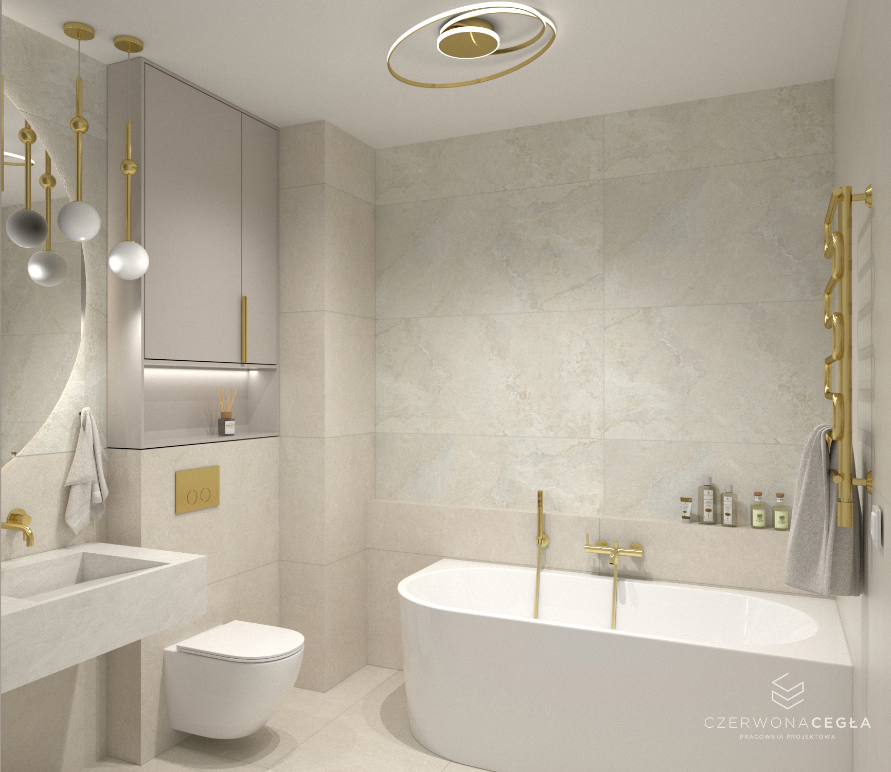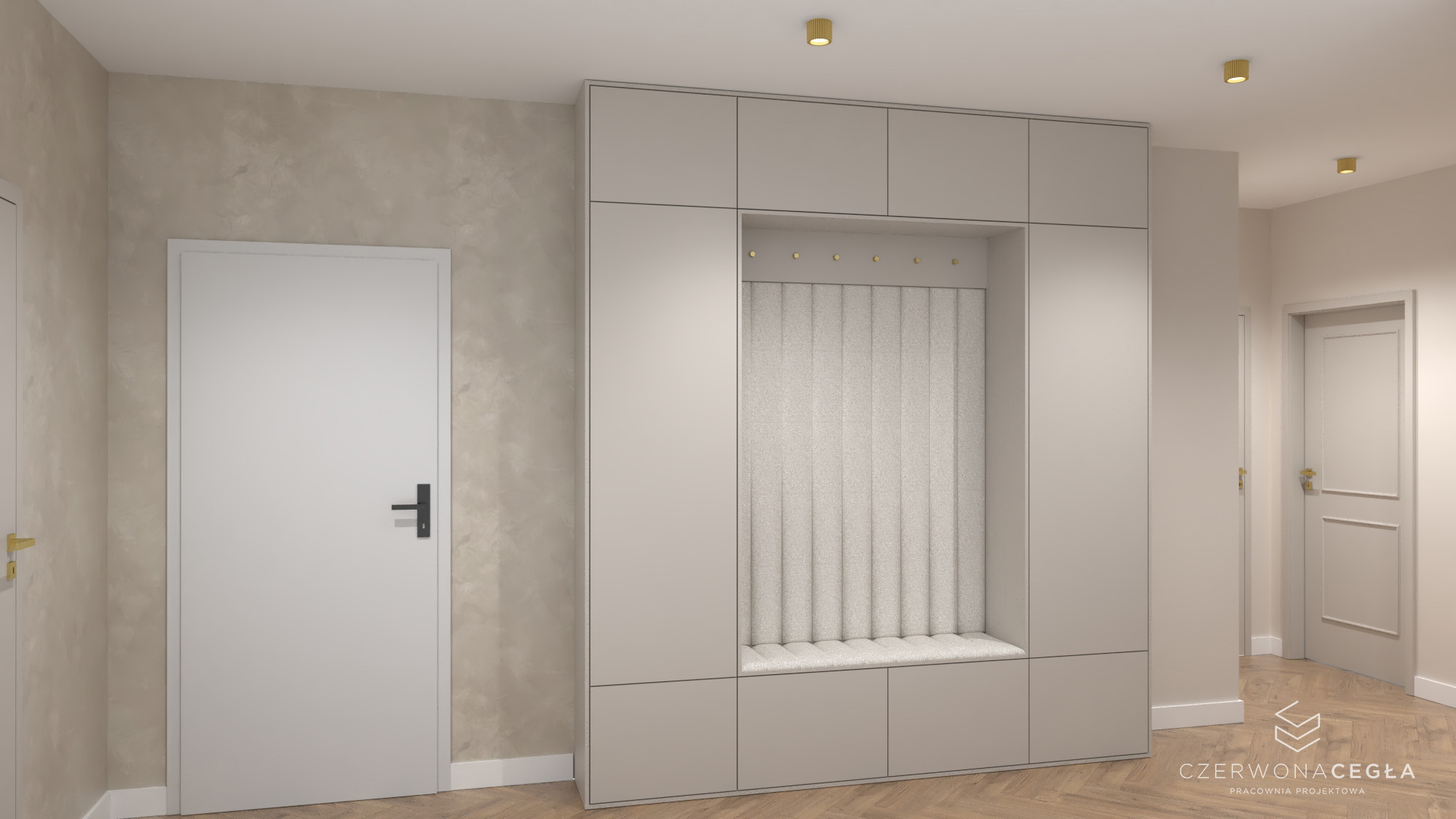 Projekt mieszkania o świetlistym wnętrzu w stylu Modern Classic, gdzie kremowe beże spotykają się z biżuteryjnymi akcentami szczotkowanego złota. Serce apartamentu stanowi reprezentacyjny salon z aneksem kuchennym, w którym połączenie odcieni beżu ze złotem świetnie się komponuje. Prywatna strefa obejmuje sypialnię z miękkim, tapicerowanym wezgłowiem, stylowy gabinet do pracy twórczej oraz łazienkę w jasnym wykończeniu, przypominającą ekskluzywne SPA. Całość dopełniają lustra i subtelne sztukaterie, tworząc przestrzeń pełną blasku, elegancji i ponadczasowego szyku.