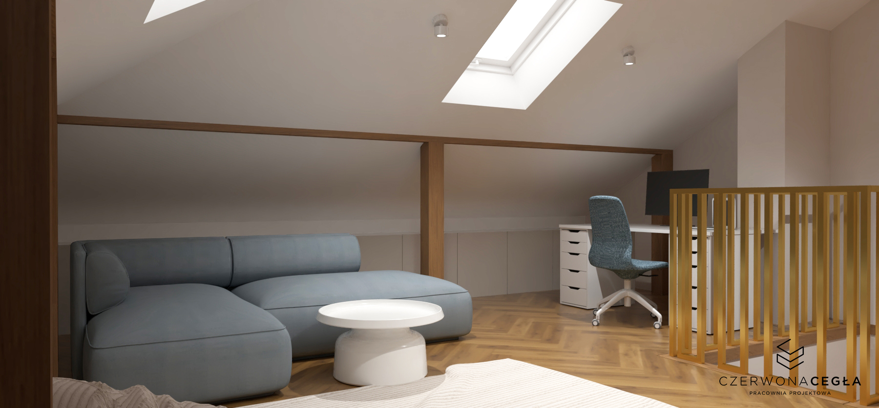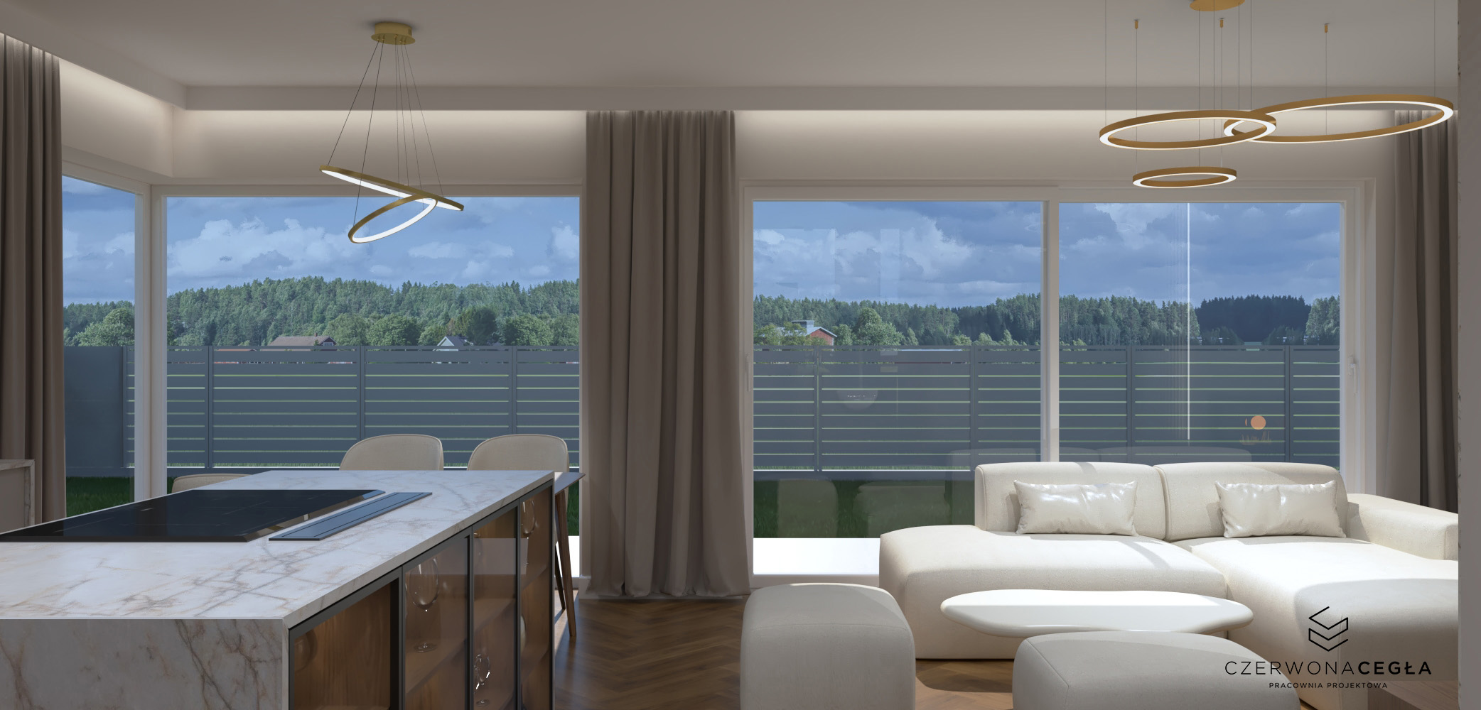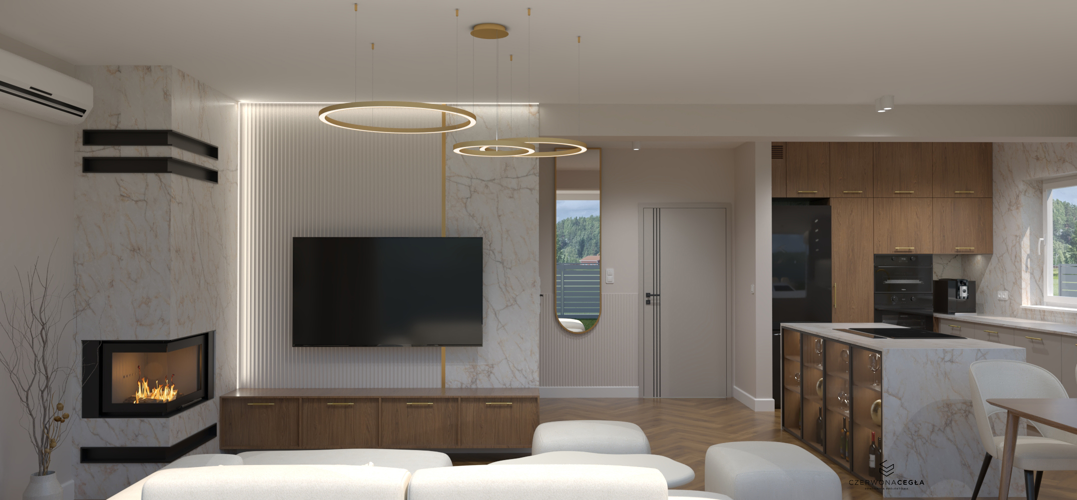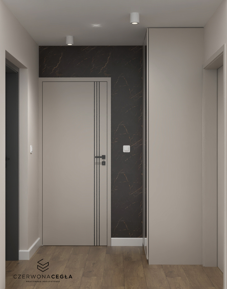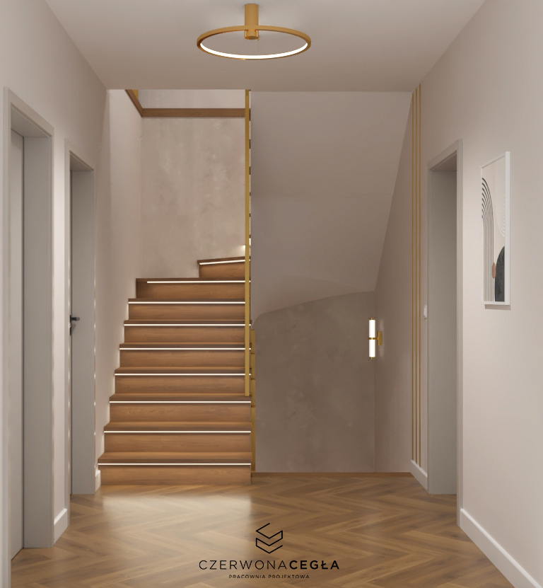 Nowoczesne wnętrze domu z elementami złota łączy elegancję z minimalizmem. Jasna kolorystyka – biele, szarości i beże – stanowi tło dla subtelnych, złotych akcentów w postaci lamp, uchwytów, ram luster czy detali mebli. Proste formy, dużo światła dziennego i otwarte przestrzenie podkreślają nowoczesny charakter, a złoto dodaje wnętrzu luksusu i ciepła, nie przytłaczając aranżacji.