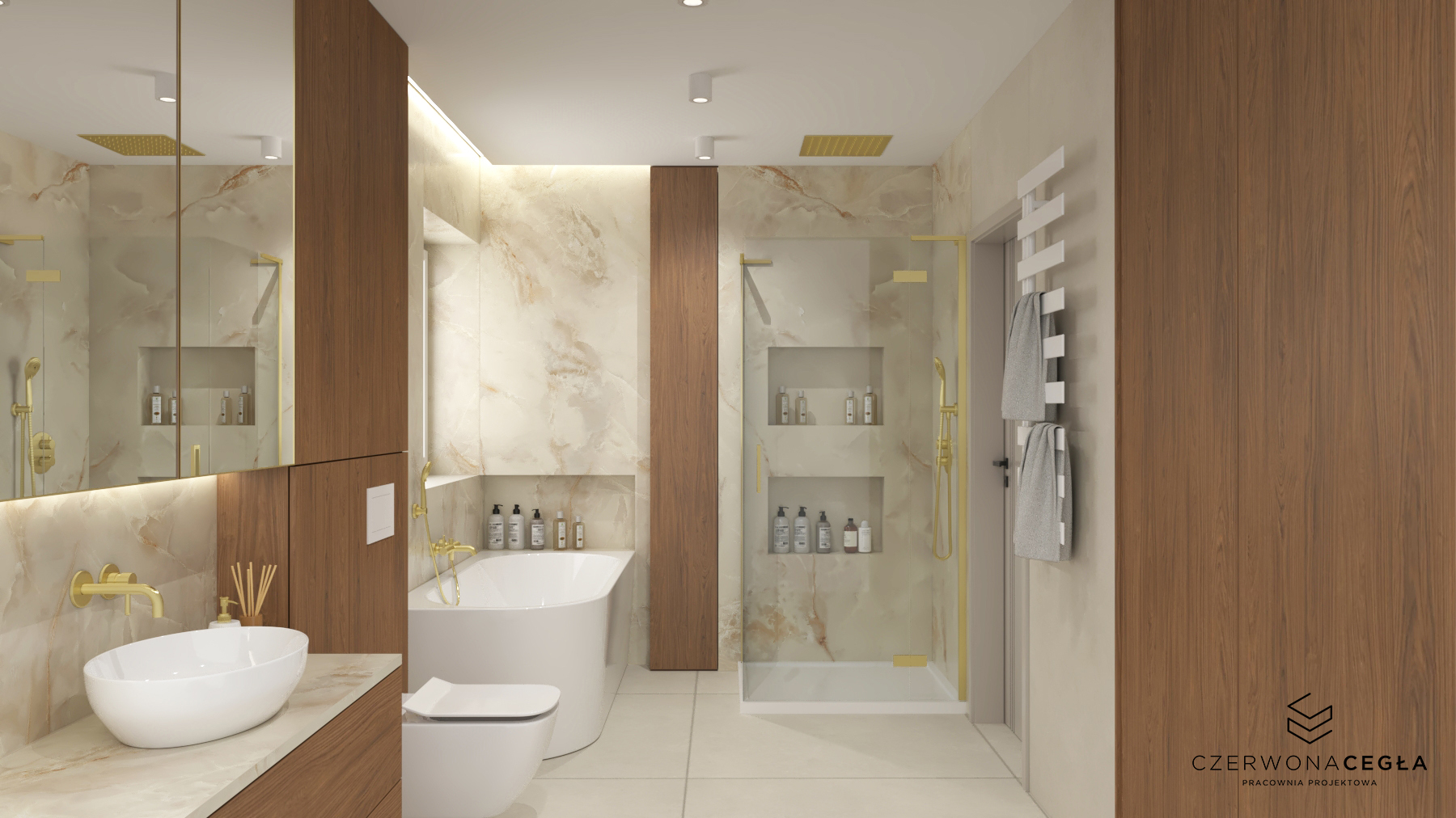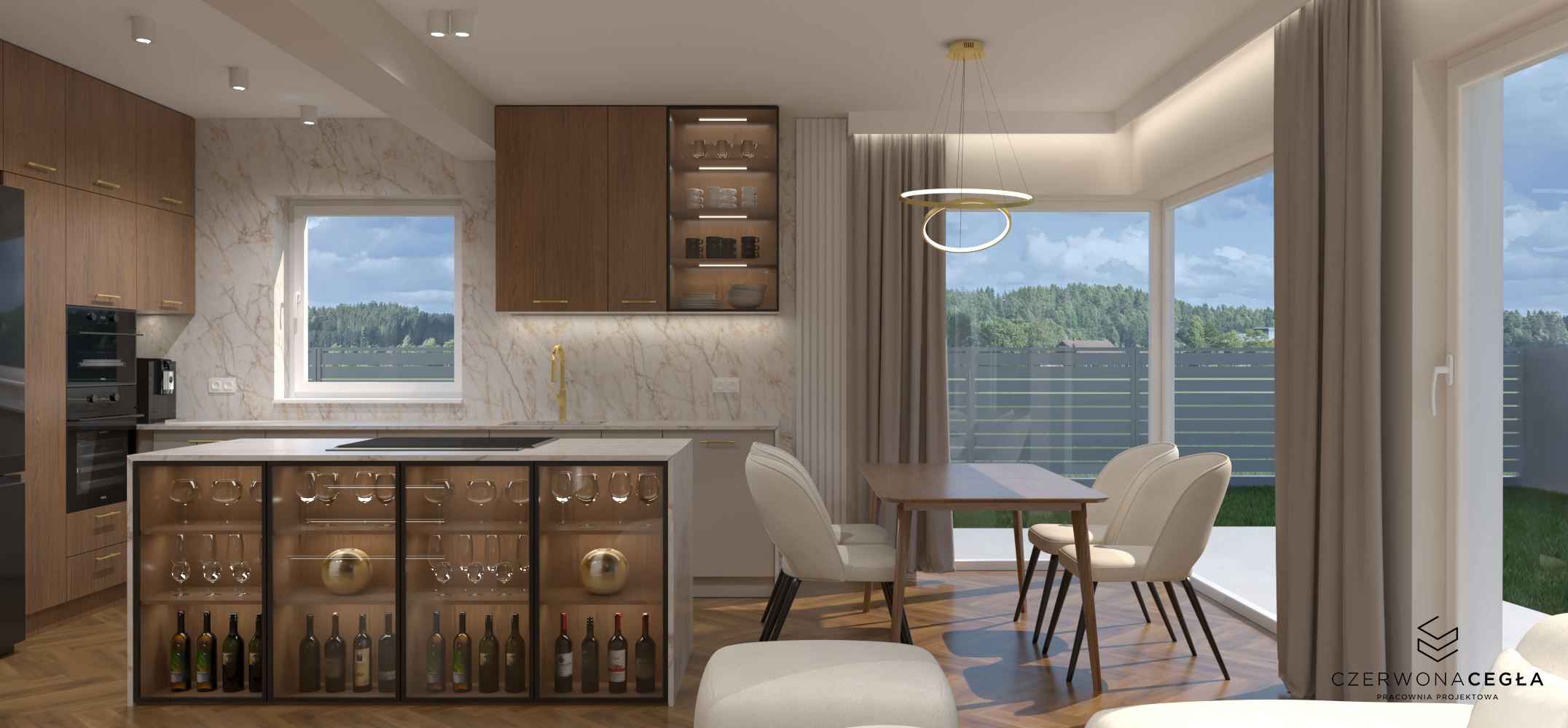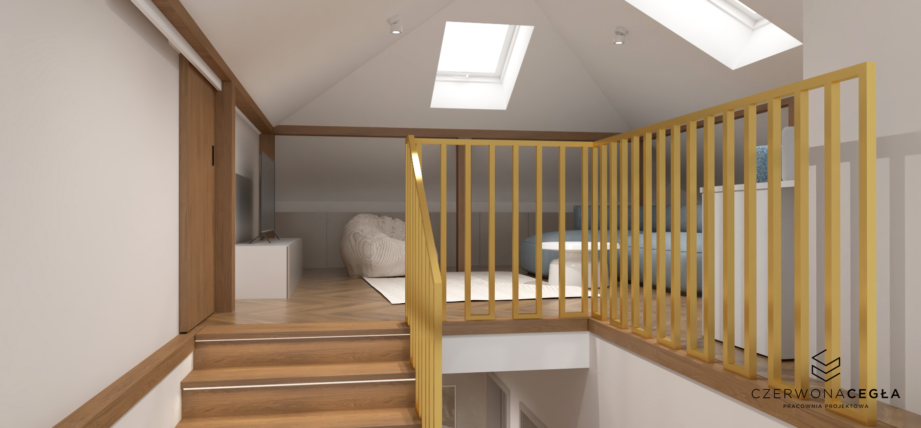 Nowoczesne wnętrze domu z elementami złota łączy elegancję z minimalizmem. Jasna kolorystyka – biele, szarości i beże – stanowi tło dla subtelnych, złotych akcentów w postaci lamp, uchwytów, ram luster czy detali mebli. Proste formy, dużo światła dziennego i otwarte przestrzenie podkreślają nowoczesny charakter, a złoto dodaje wnętrzu luksusu i ciepła, nie przytłaczając aranżacji.