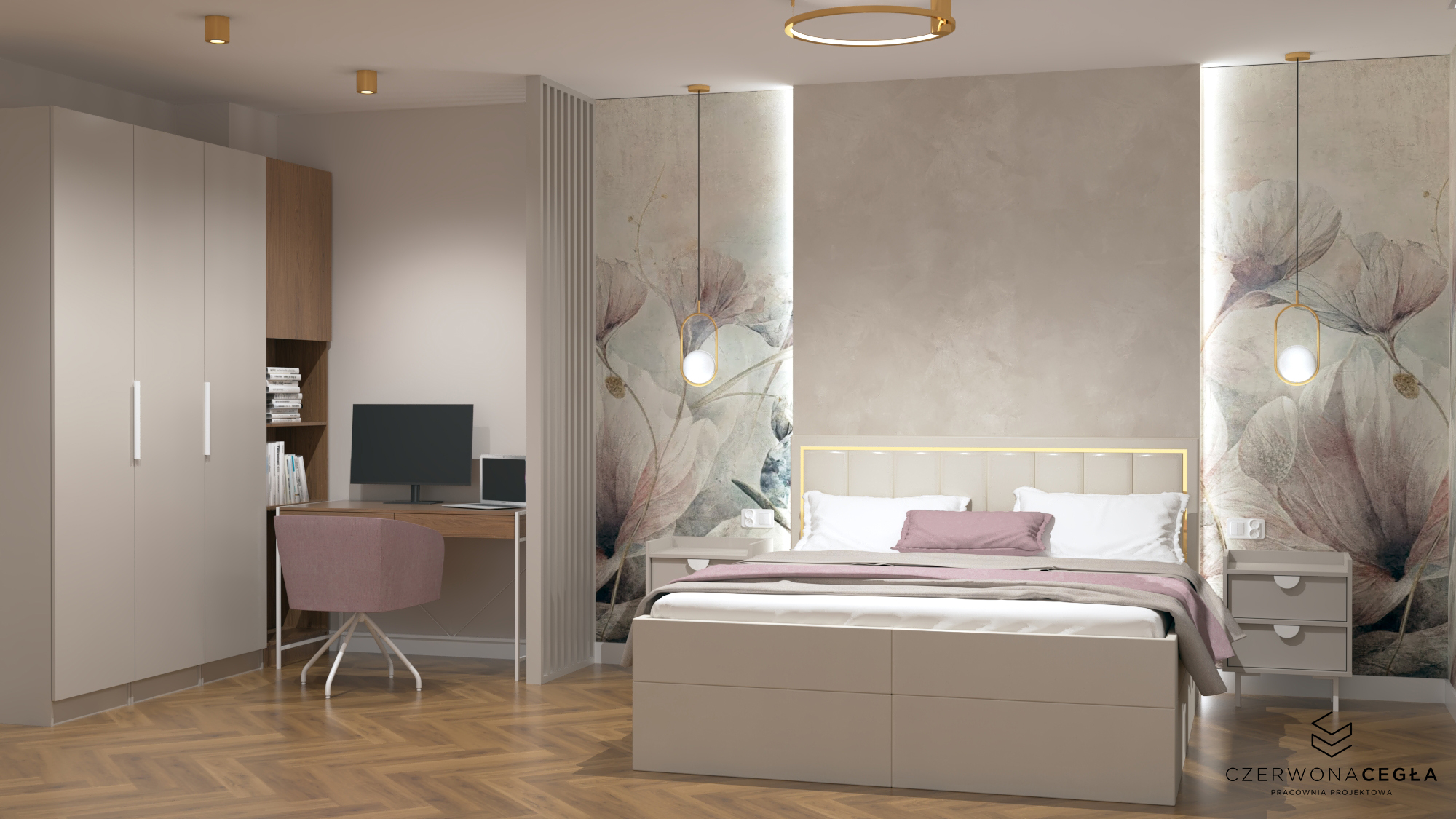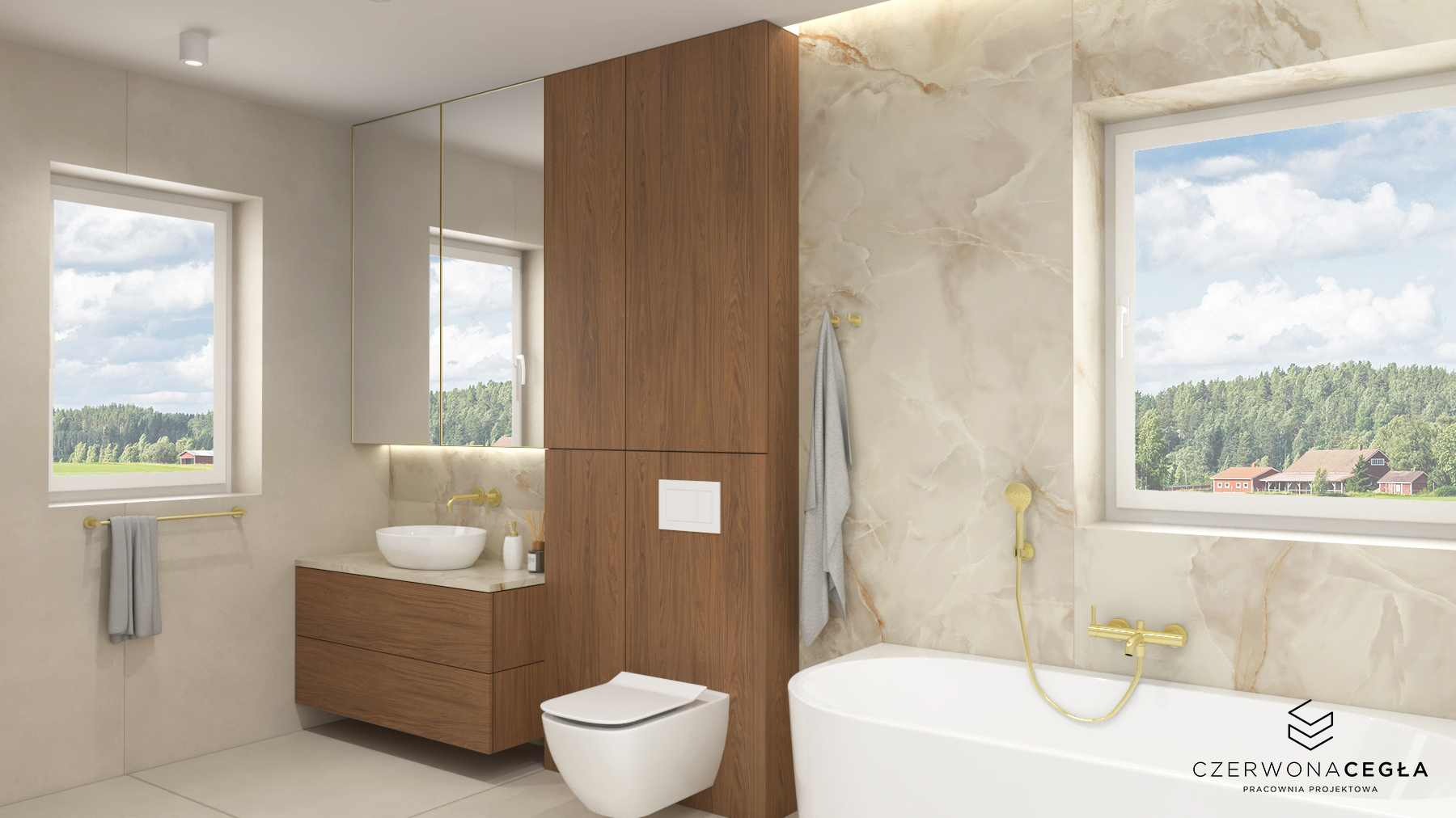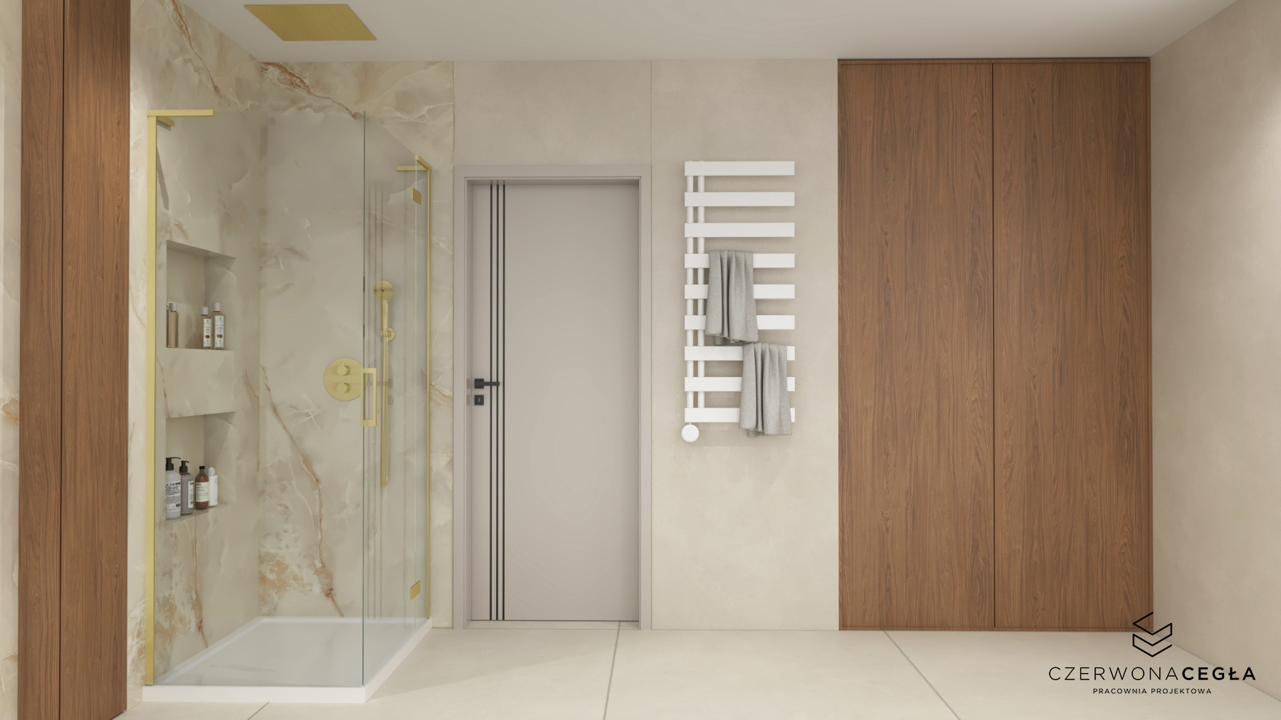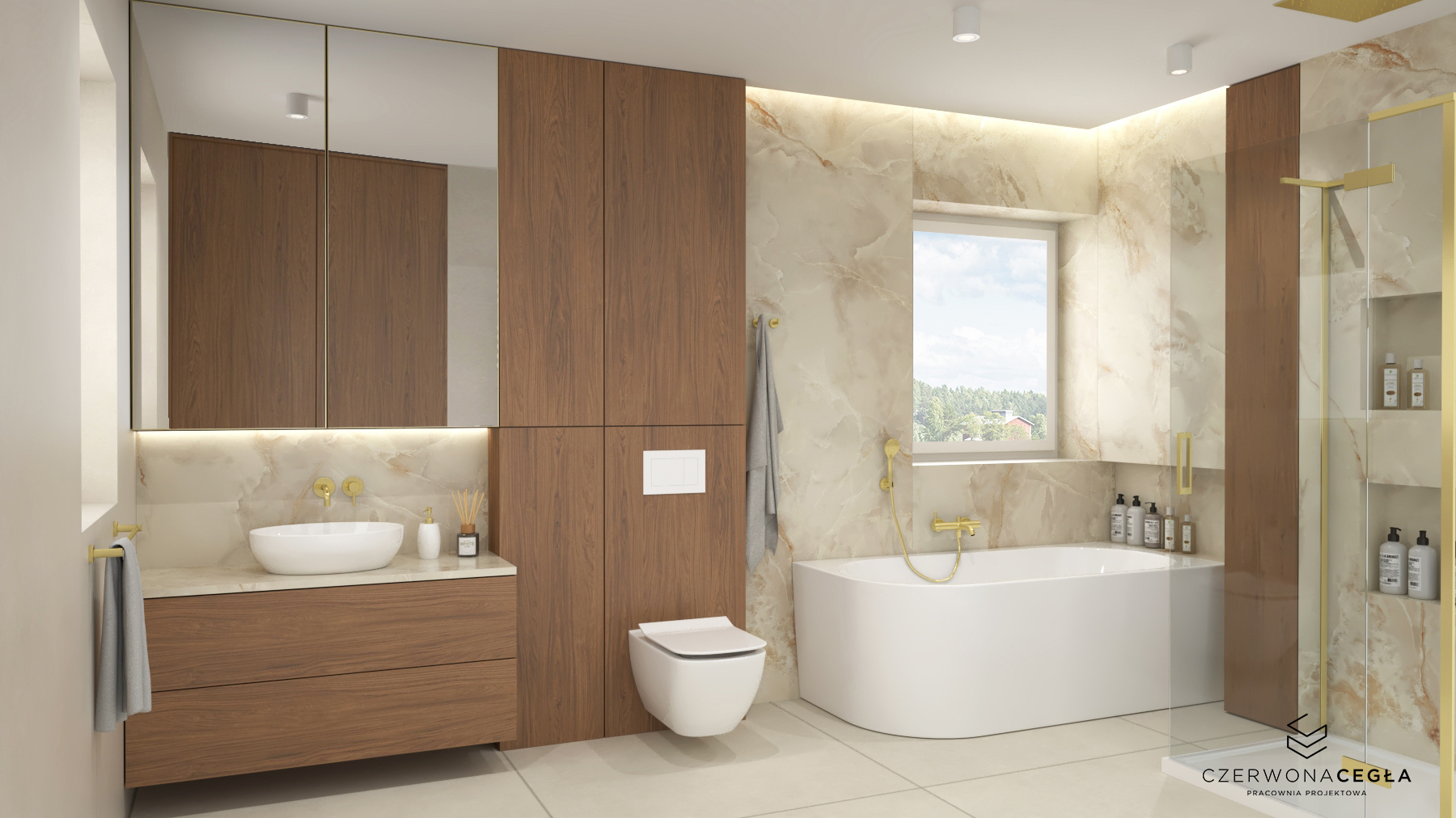 Nowoczesne wnętrze domu z elementami złota łączy elegancję z minimalizmem. Jasna kolorystyka – biele, szarości i beże – stanowi tło dla subtelnych, złotych akcentów w postaci lamp, uchwytów, ram luster czy detali mebli. Proste formy, dużo światła dziennego i otwarte przestrzenie podkreślają nowoczesny charakter, a złoto dodaje wnętrzu luksusu i ciepła, nie przytłaczając aranżacji.