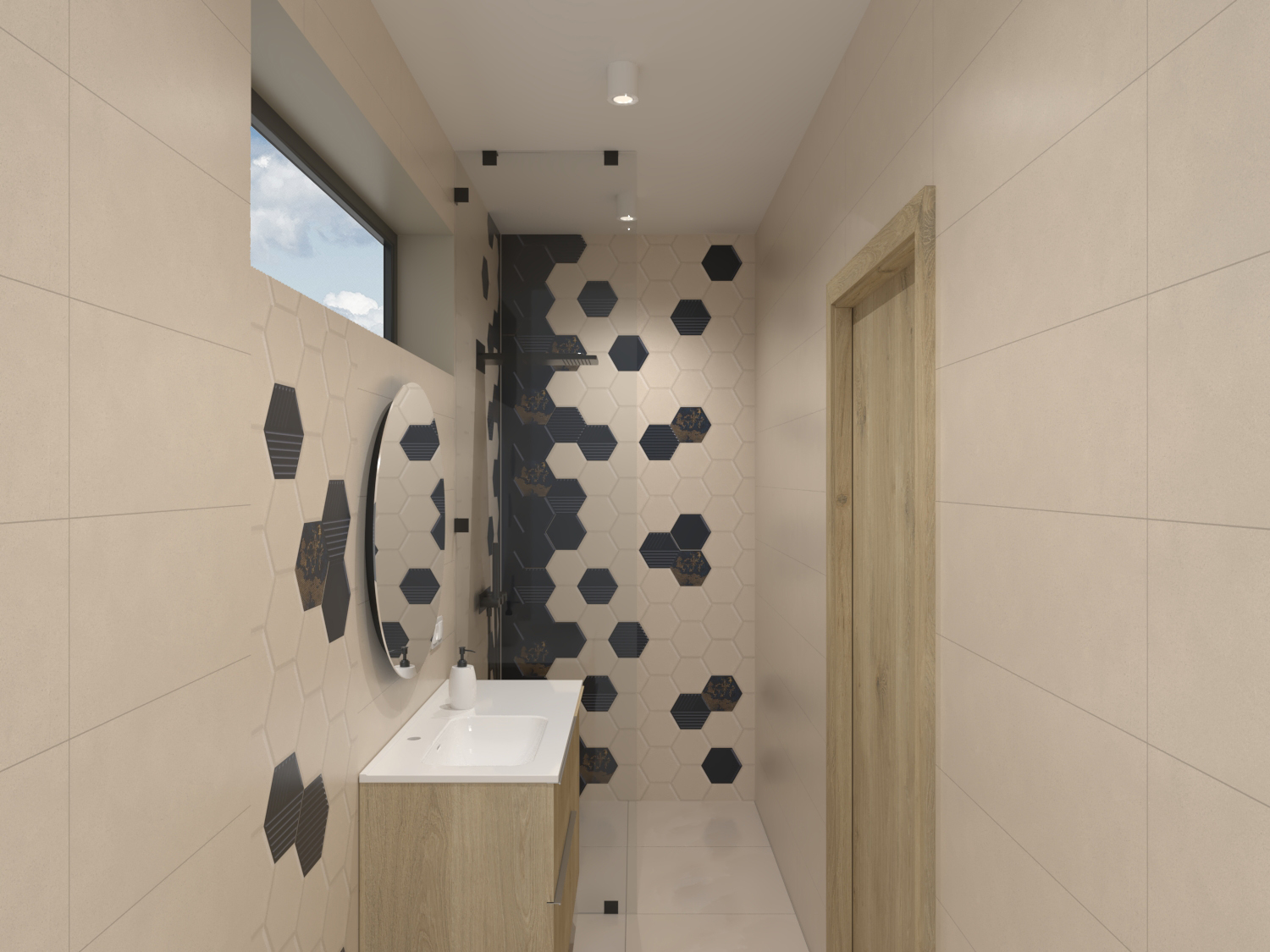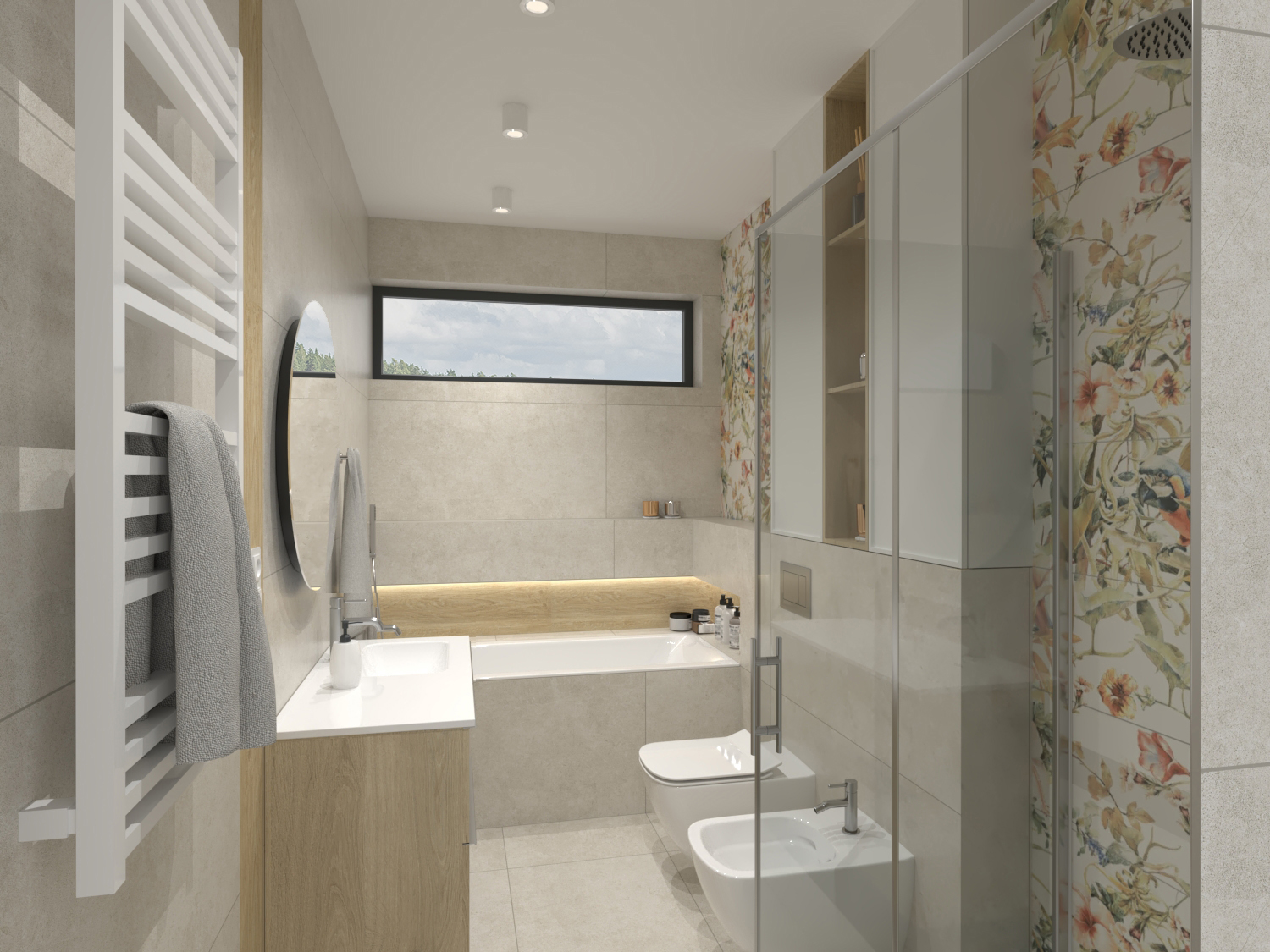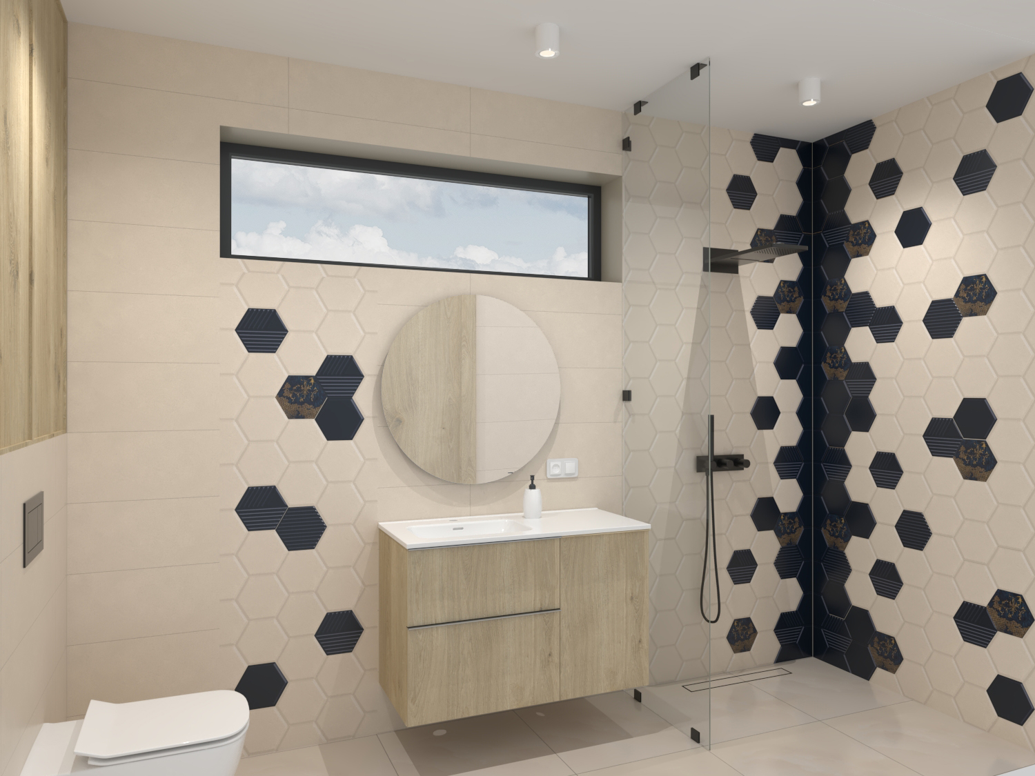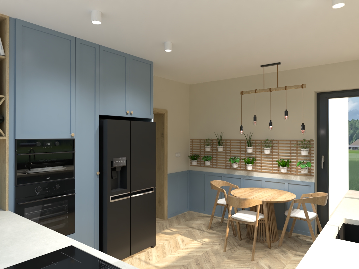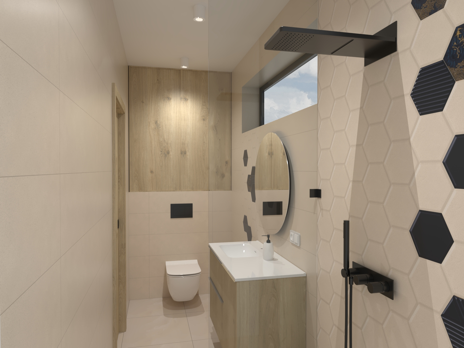 Projekt wnętrza domu łączy nowoczesność z odważnymi akcentami kolorystycznymi. W salonie i kuchni dominują głębokie odcienie niebieskiego, które nadają przestrzeni elegancji i spokoju. Meble o prostych formach kontrastują z wyrazistymi kolorami, tworząc dynamiczną, ale harmonijną całość. Łazienki wyróżniają się oryginalnymi połączeniami kolorów oraz płytek. Całość tworzy przestrzeń pełną energii, ale jednocześnie wyważoną i komfortową.