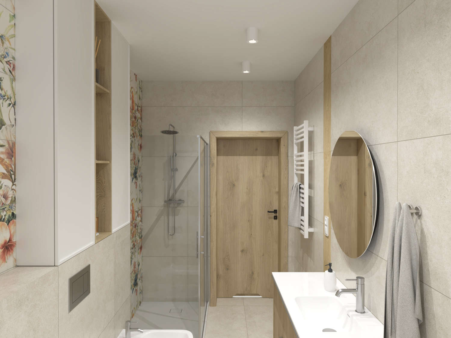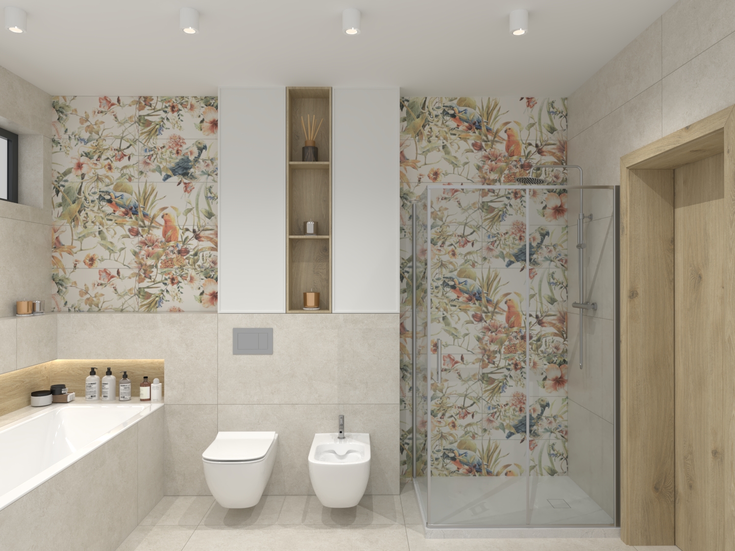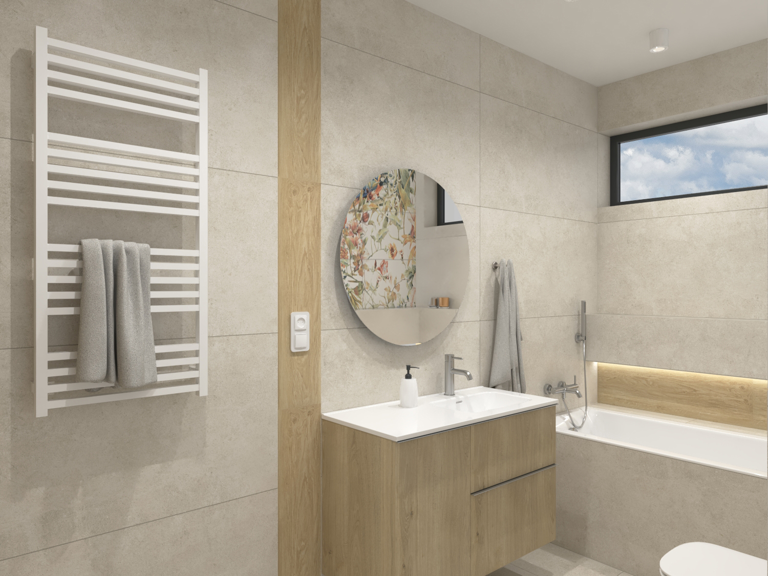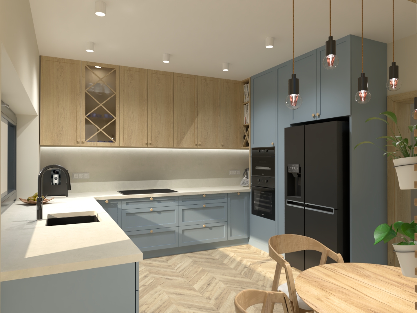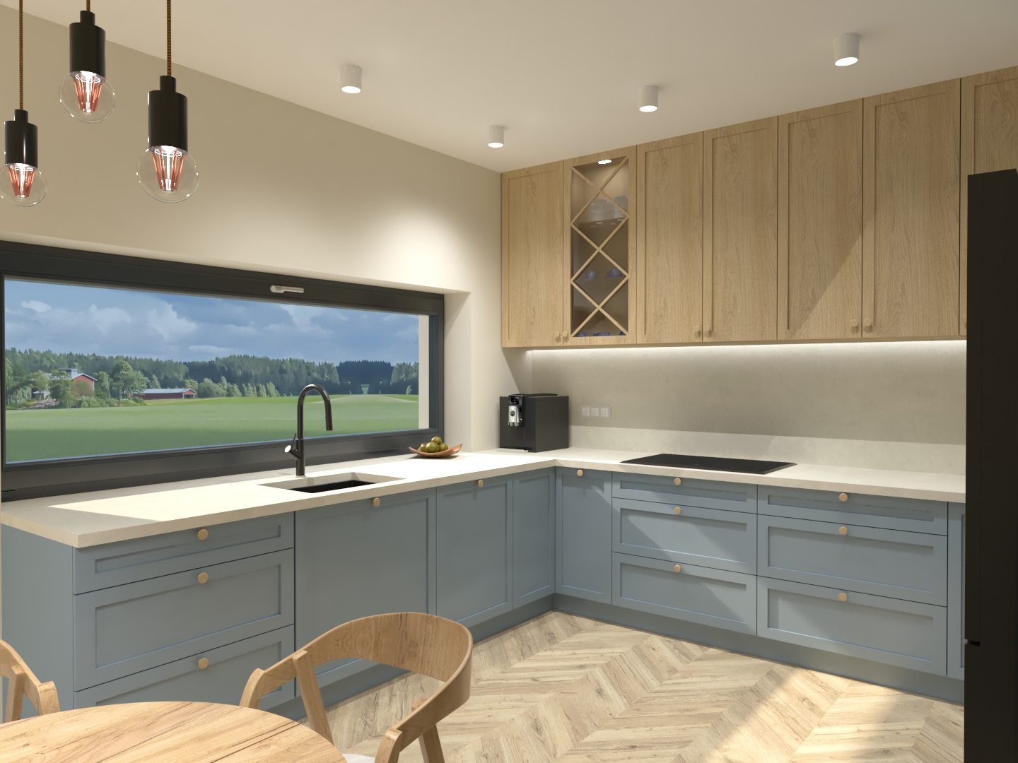 Projekt wnętrza domu łączy nowoczesność z odważnymi akcentami kolorystycznymi. W salonie i kuchni dominują głębokie odcienie niebieskiego, które nadają przestrzeni elegancji i spokoju. Meble o prostych formach kontrastują z wyrazistymi kolorami, tworząc dynamiczną, ale harmonijną całość. Łazienki wyróżniają się oryginalnymi połączeniami kolorów oraz płytek. Całość tworzy przestrzeń pełną energii, ale jednocześnie wyważoną i komfortową.