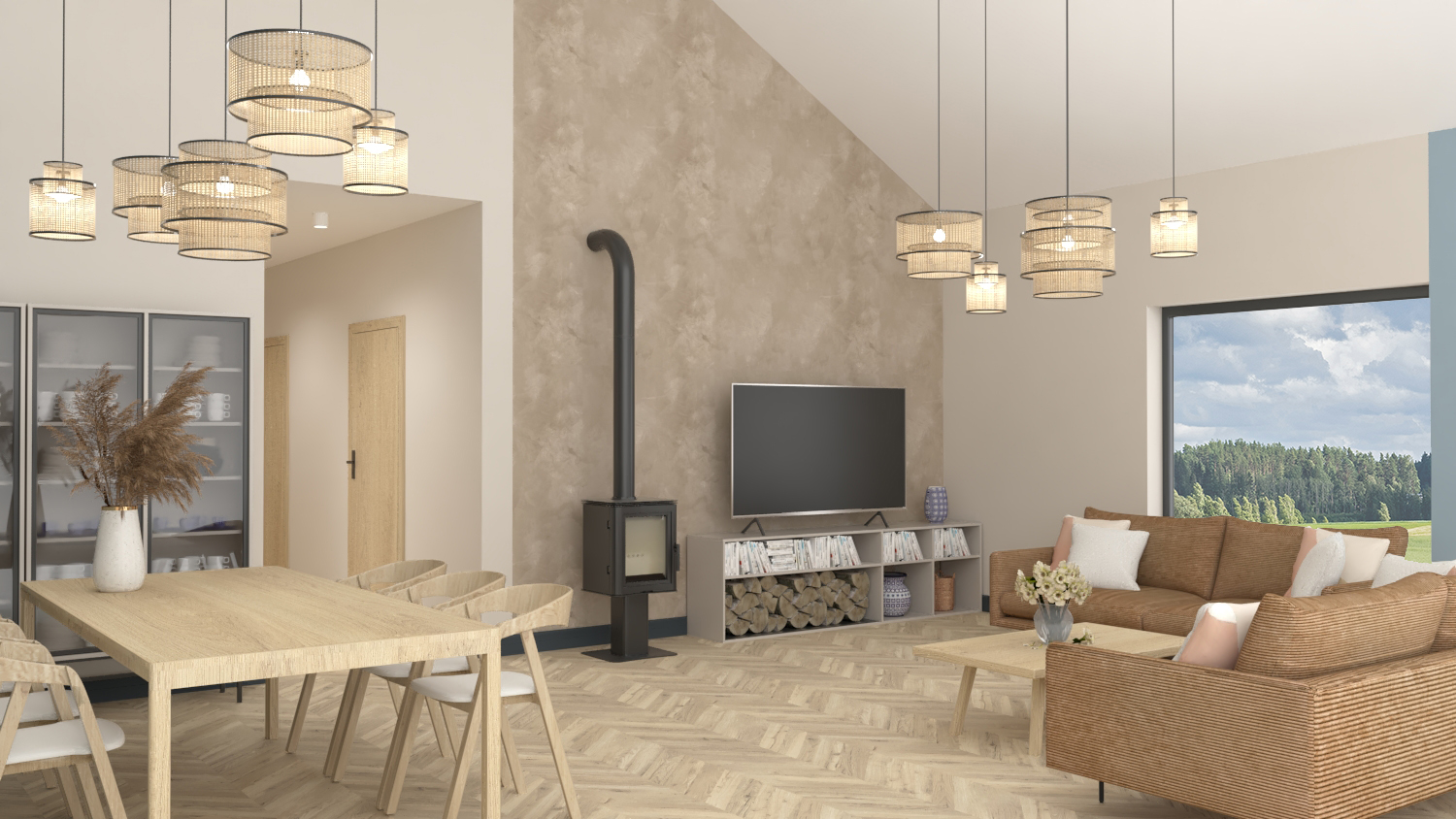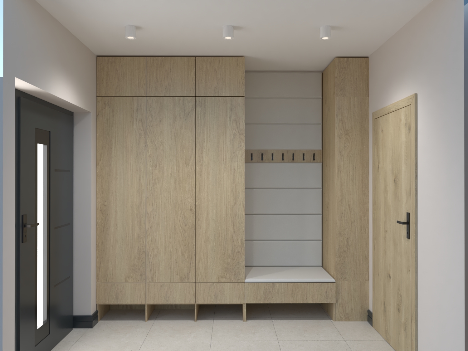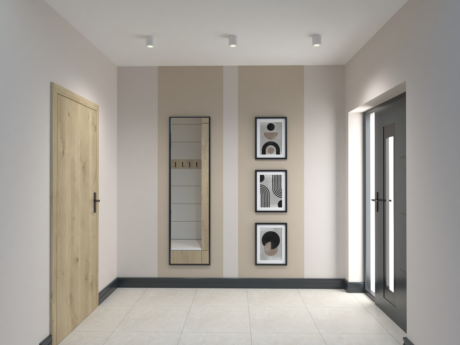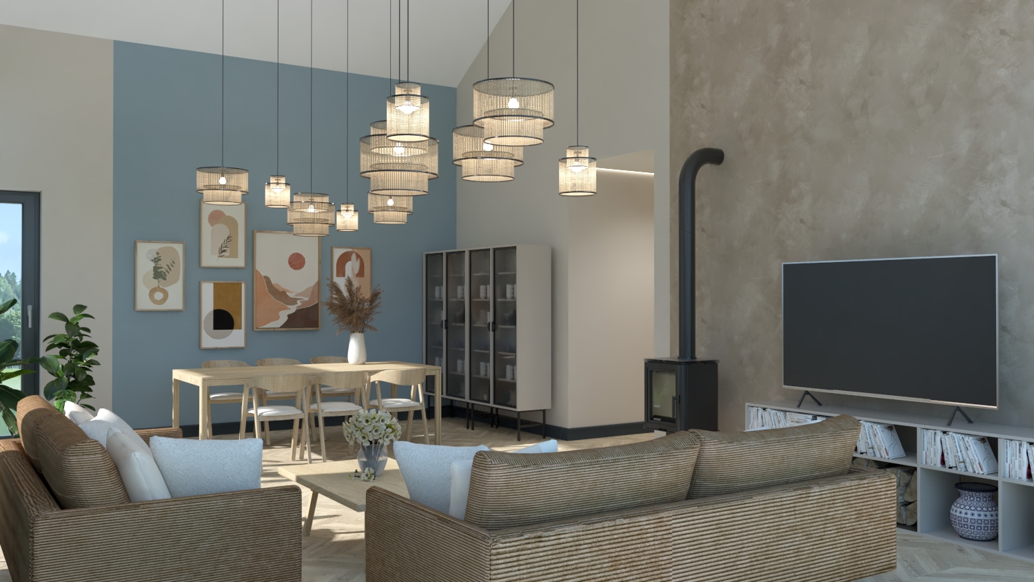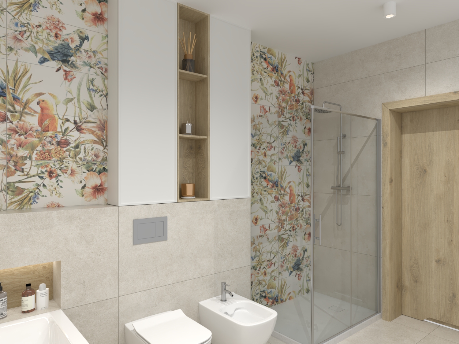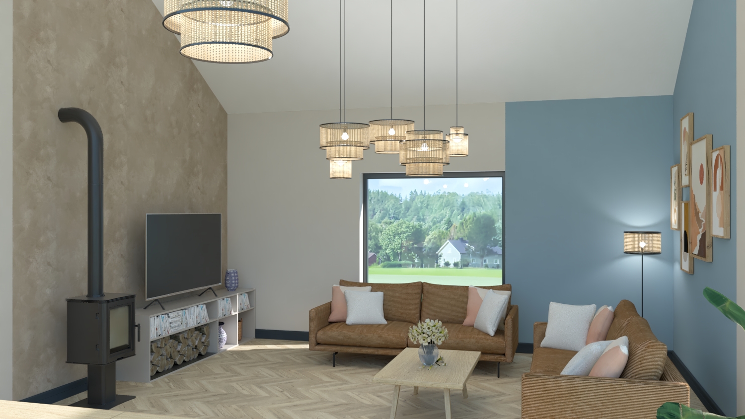 Projekt wnętrza domu łączy nowoczesność z odważnymi akcentami kolorystycznymi. W salonie i kuchni dominują głębokie odcienie niebieskiego, które nadają przestrzeni elegancji i spokoju. Meble o prostych formach kontrastują z wyrazistymi kolorami, tworząc dynamiczną, ale harmonijną całość. Łazienki wyróżniają się oryginalnymi połączeniami kolorów oraz płytek. Całość tworzy przestrzeń pełną energii, ale jednocześnie wyważoną i komfortową.