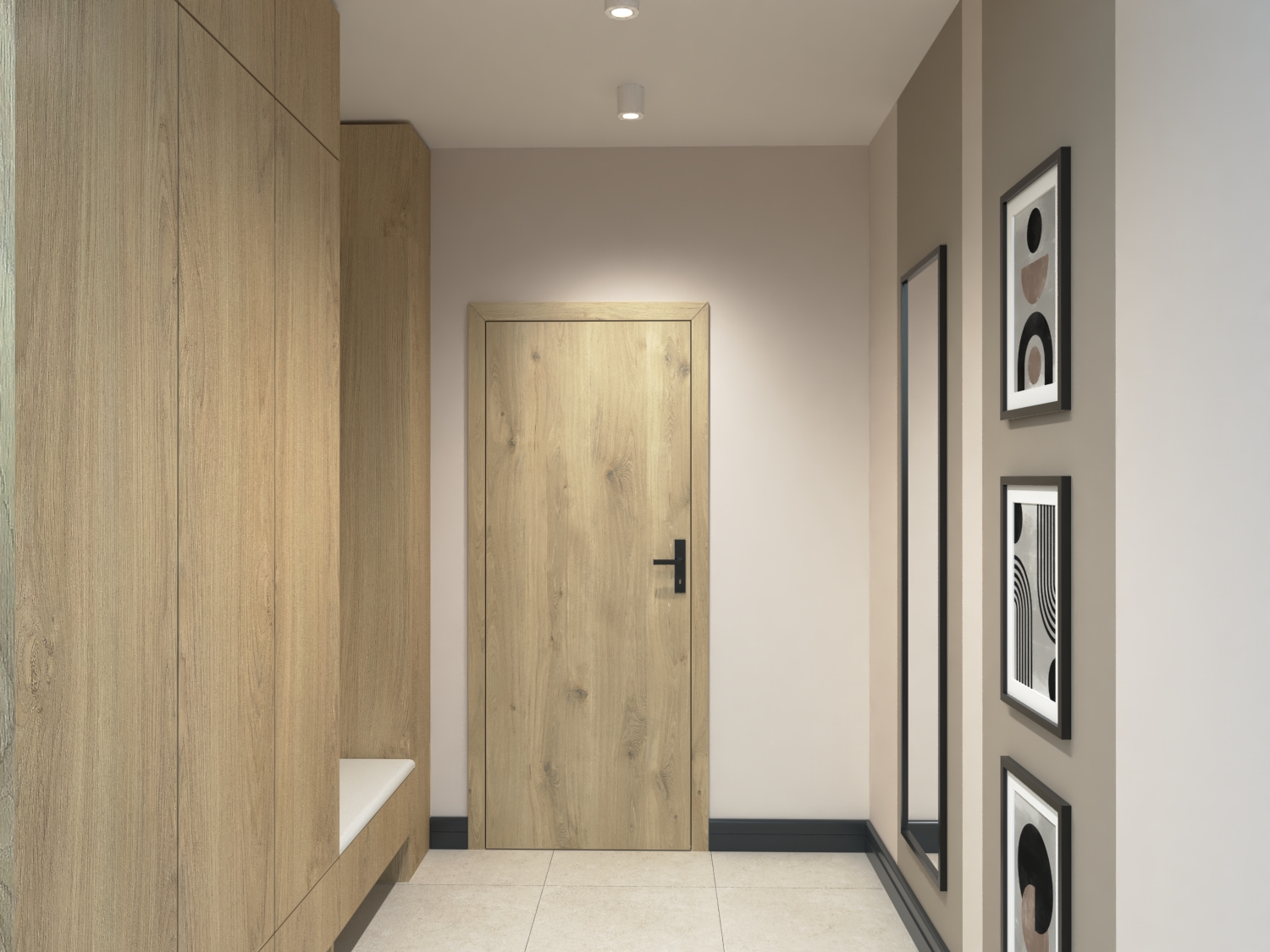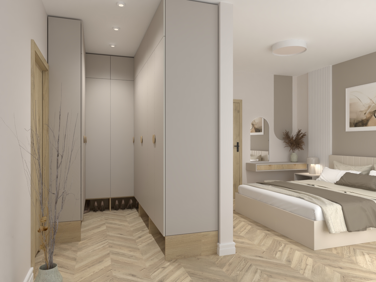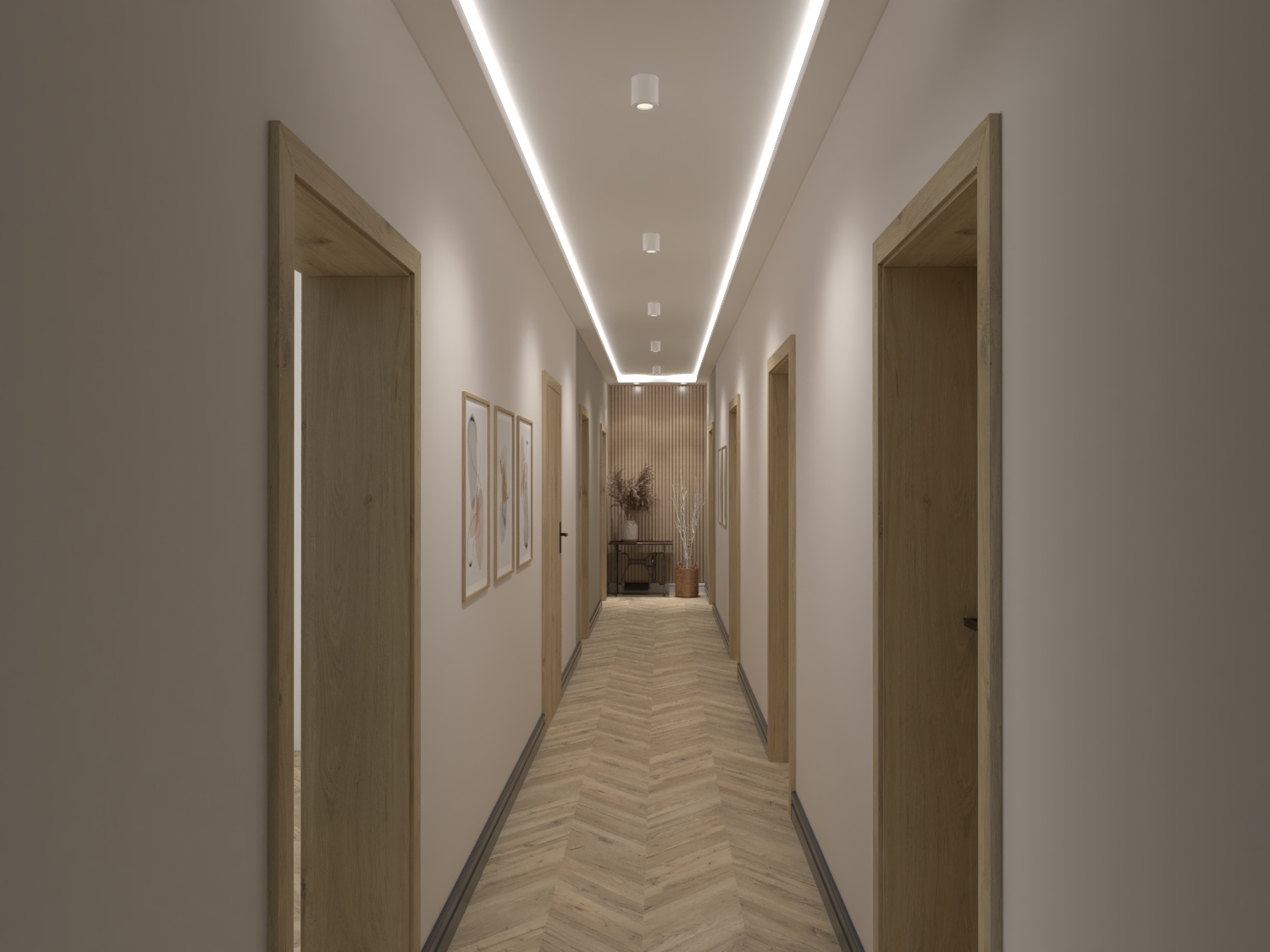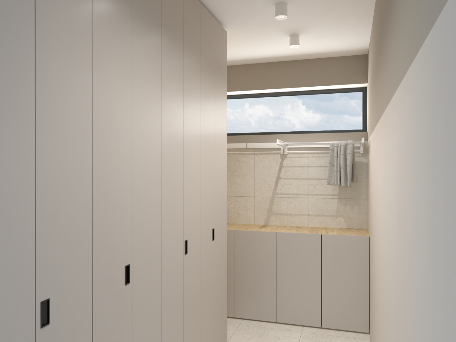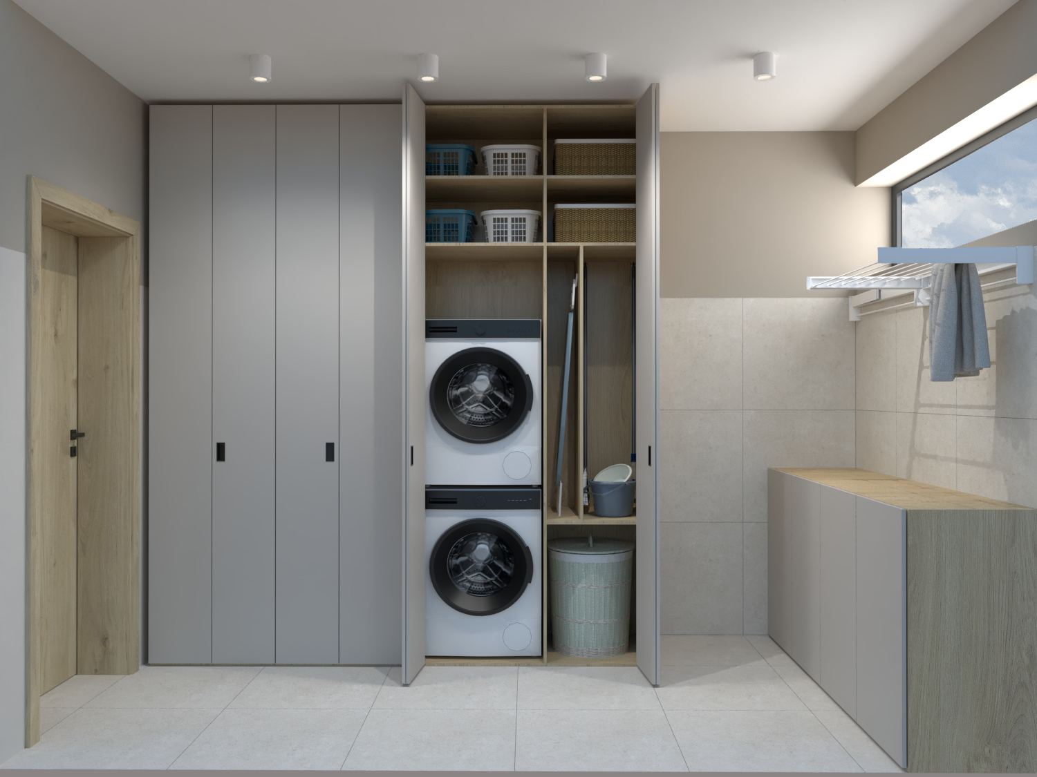 Projekt wnętrza domu łączy nowoczesność z odważnymi akcentami kolorystycznymi. W salonie i kuchni dominują głębokie odcienie niebieskiego, które nadają przestrzeni elegancji i spokoju. Meble o prostych formach kontrastują z wyrazistymi kolorami, tworząc dynamiczną, ale harmonijną całość. Łazienki wyróżniają się oryginalnymi połączeniami kolorów oraz płytek. Całość tworzy przestrzeń pełną energii, ale jednocześnie wyważoną i komfortową.