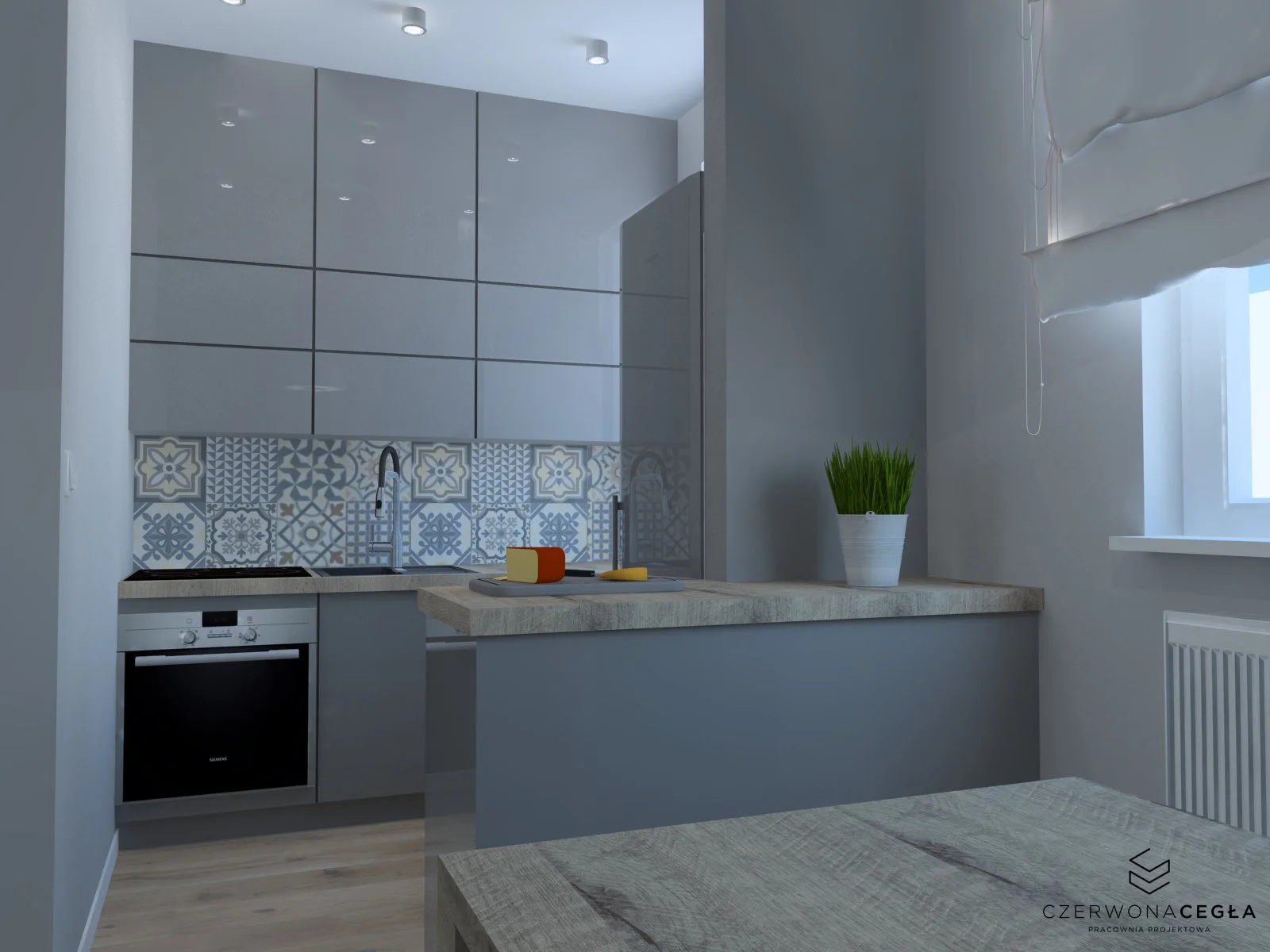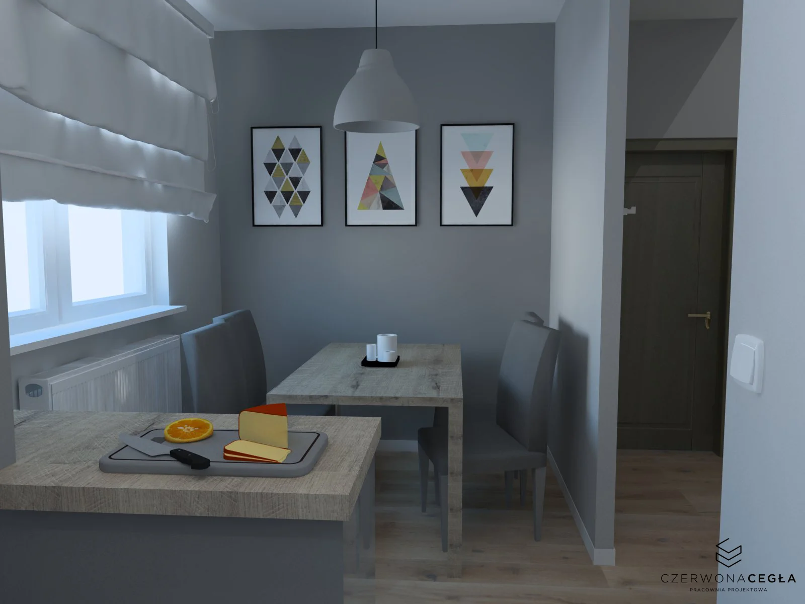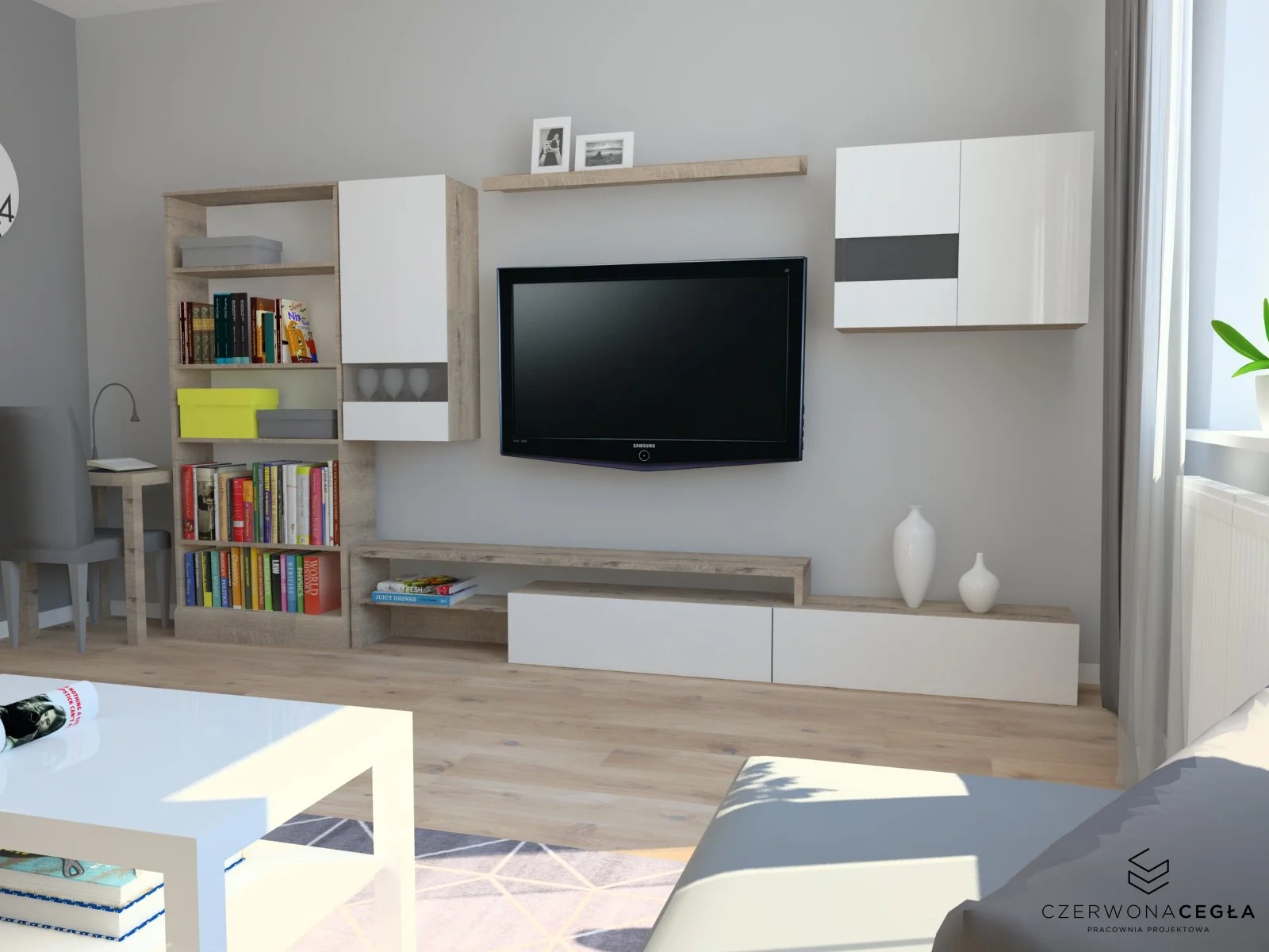 Dla młodego małżeństwa z Rybnika przygotowaliśmy stylową aranżację kawalerki. Wykorzystując dostępny metraż podzieliliśmy mieszkanie na dwa pomieszczenia – kuchnię z jadalnią i salon z funkcją sypialni. To właśnie w nim zależało nam na stworzeniu miejsca noclegowego. W salonie stanęła duża szafa do przechowywania ubrań oraz mały stolik przy którym można się pouczyć i popracować. Główną rolę gra jednak meblościanka, którą chcieli zachować klienci. Jest to dobre rozwiązanie bo obudowuje telewizor, tworząc jednocześnie miejsce do przechowywania. Przechodząc do drugiego pomieszczenia, które oddzielono od przedpokoju krótką ścianką działową. To sprawia wrażenie, jakby tych pomieszczeń w mieszkaniu było więcej, a jednocześnie oddziela strefę wejściową od pomieszczenia w którym spożywa się posiłki. Kuchnia nie należy do dużych, ale zdecydowano się na oddzielenie jej od stołu z krzesłami za pomocą wyspy z szafkami, dzięki czemu zyskano miejsce do przechowywania garnków lub talerzy. Całość utrzymana jest w kolorystyce bieli i jasnych odcieni szarości.